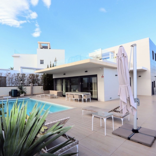 Villa for Sale in the exclusive area of Costa Blanca south.Fantastic new build villa in an excellent area, close to the white sandy beaches and the sea.Villa contains 3 bright spacious bedrooms, 2 bathrooms, a large living room, dining room, kitchen equipped with all necesarry appliances, a terrace and a large swimming pool with garden area.Cabo Roig is an elite area in the south of Orihuela Costa, close to the beautiful beach and very close to the best golf fields. The infrastructure is fully developed, there you can find entertainment centres for all ages and the most important amenities. Only few min to the sea. A short drive till the province's largest shopping centres and the lake of Torrevieja. The nearest international airport of Alicante( Spain) in 30 minutes.