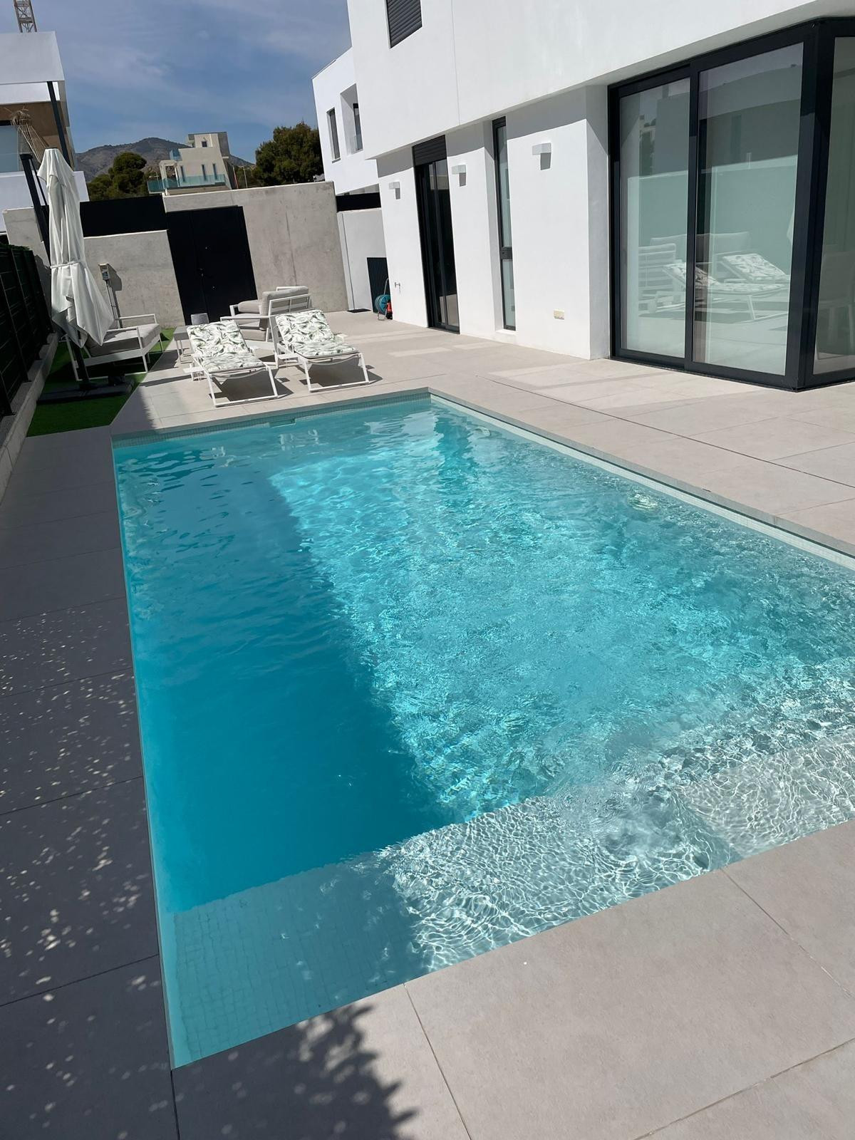 Discover the villa of your dreams! This modern and luxurious two-storey detached villa, designed with the latest technology, offers you a sophisticated and comfortable lifestyle. Upon entering, you will be amazed by its spacious and light-filled rooms, including an impressive solarium with panoramic sea and mountain views.On the basement level, you will find an additional bedroom that can be transformed into a private gym or an elegant home cinema. The villa has a magnificent private swimming pool surrounded by a large terrace, ideal for sunbathing and outdoor gatherings. It also offers indoor parking for two cars, guaranteeing your comfort and security.Equipped with state-of-the-art appliances, complete bathrooms with luxury finishes, spacious dressing rooms and built-in wardrobes, every detail of this residence has been carefully thought out. Security is not left behind, with an alarm system and video entry phone providing total peace of mind.Located close to all essential services, the airport, and the exclusive Puig Campana golf course, this villa is perfect for golf lovers and those looking for a home in a privileged setting. Come and experience the luxury and comfort that only this extraordinary villa can offer.
