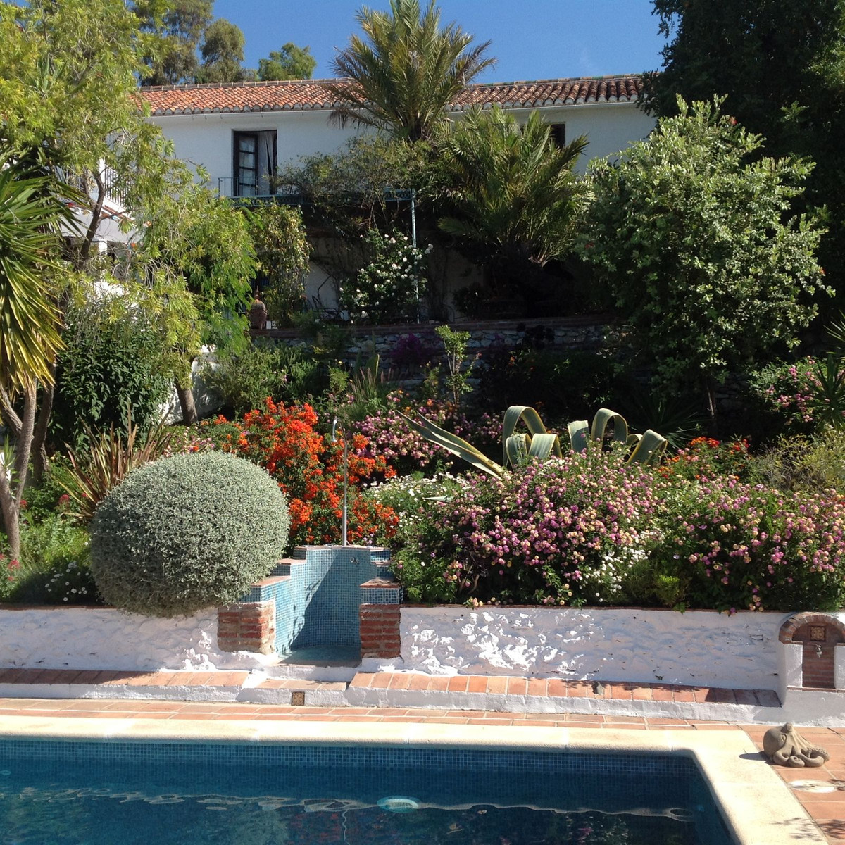 Tomten med sina medelhavsträdgårdar är inramad av fantastiska vyer och har flera terrasser, innergårdar, olivträd, promenadvägar, för många för att nämna. Det finns till och med en trädkoja för de yngre bland oss. Poolen är centralt belägen och mäter 9,5 x 4,5 meter. Runt poolen finns solstolar med parasoll för alla som är på humör för en avkopplande dag under den andalusiska solen.