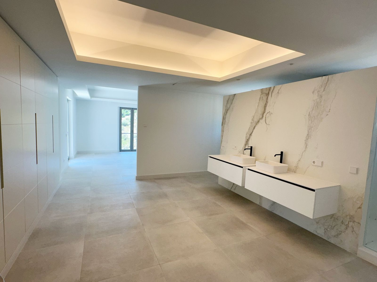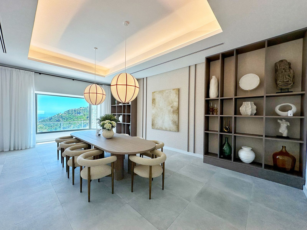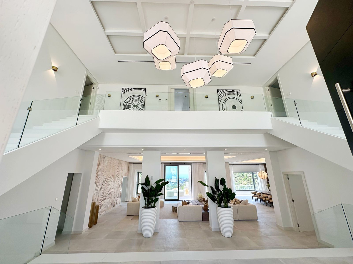 As you enter, you'll be greeted by a grand entrance hall leading to a spacious open-concept living room, an elegant dining area, and an oversized kitchen. Additionally, a stunning double-height office space provides a perfect work environment, all while enjoying unobstructed views of the El Madroñal mountains and the Mediterranean Sea.