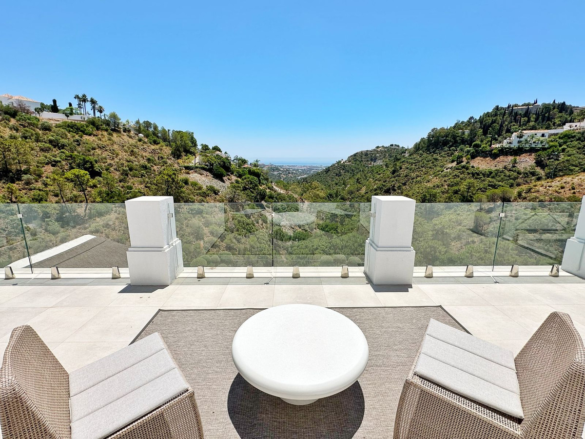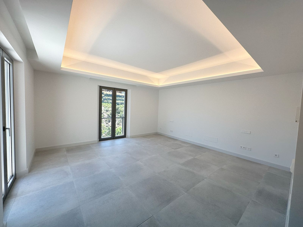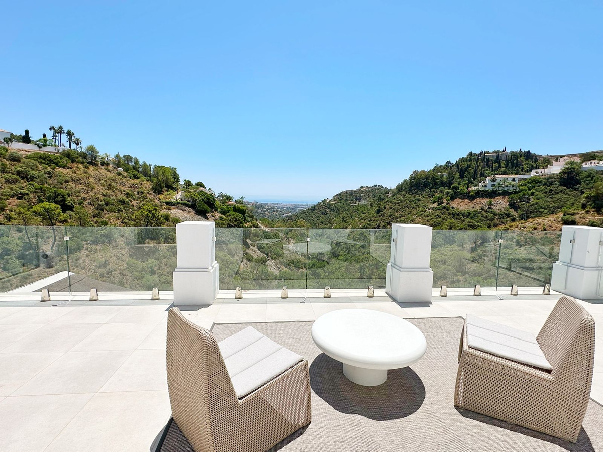 As you enter, you'll be greeted by a grand entrance hall leading to a spacious open-concept living room, an elegant dining area, and an oversized kitchen. Additionally, a stunning double-height office space provides a perfect work environment, all while enjoying unobstructed views of the El Madroñal mountains and the Mediterranean Sea.