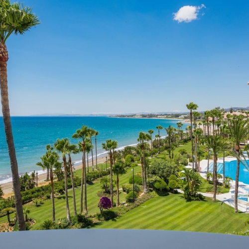 Apartment for sale in Nueva Atalaya, Estepona with 3 bedrooms, 2 bathrooms, 1 on suite bathroom and with orientation west, with communal swimming pool, private garage (2 parking spaces) and communal garden. Regarding property dimensions, it has 122 m² built, 115 m² interior and 78 m² terrace. Has the following facilities front line golf, mountainside, amenities near, air conditioning, central heating, fully fitted kitchen, marble floors, satellite tv, storage room, gym, alarm, security entrance, double glazing, video entrance, dining room, barbecue, security service 24h, private terrace, kitchen equipped, living room, country view, mountain view, golf view, heated pool, automatic irrigation system, security shutters, internet - wi-fi, covered terrace, 24h service, electric blinds, fitted wardrobes, gated community, lift, garden view, panoramic view, doorman, close to children playground, close to sea / beach, close to golf, uncovered terrace, glass doors, balcony, excellent condition, urban view, ceiling cooling system, ceiling heating system, close to shops, close to town, close to port, close to schools, surveillance cameras, inside golf resort and pets allowed.