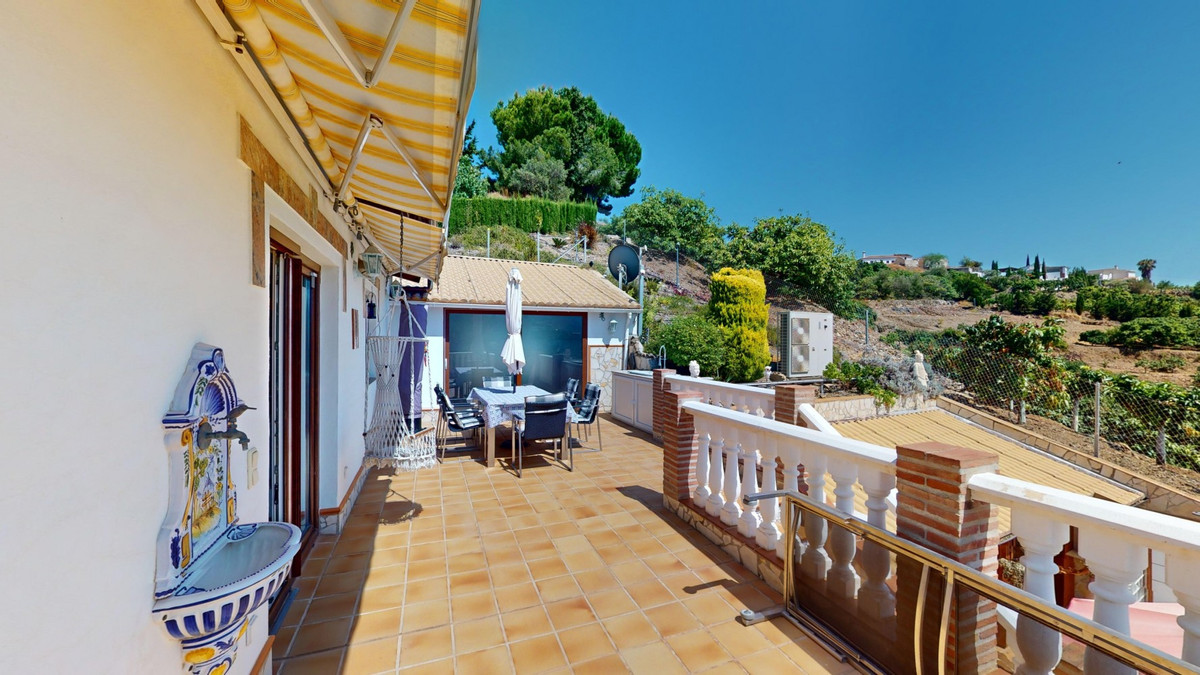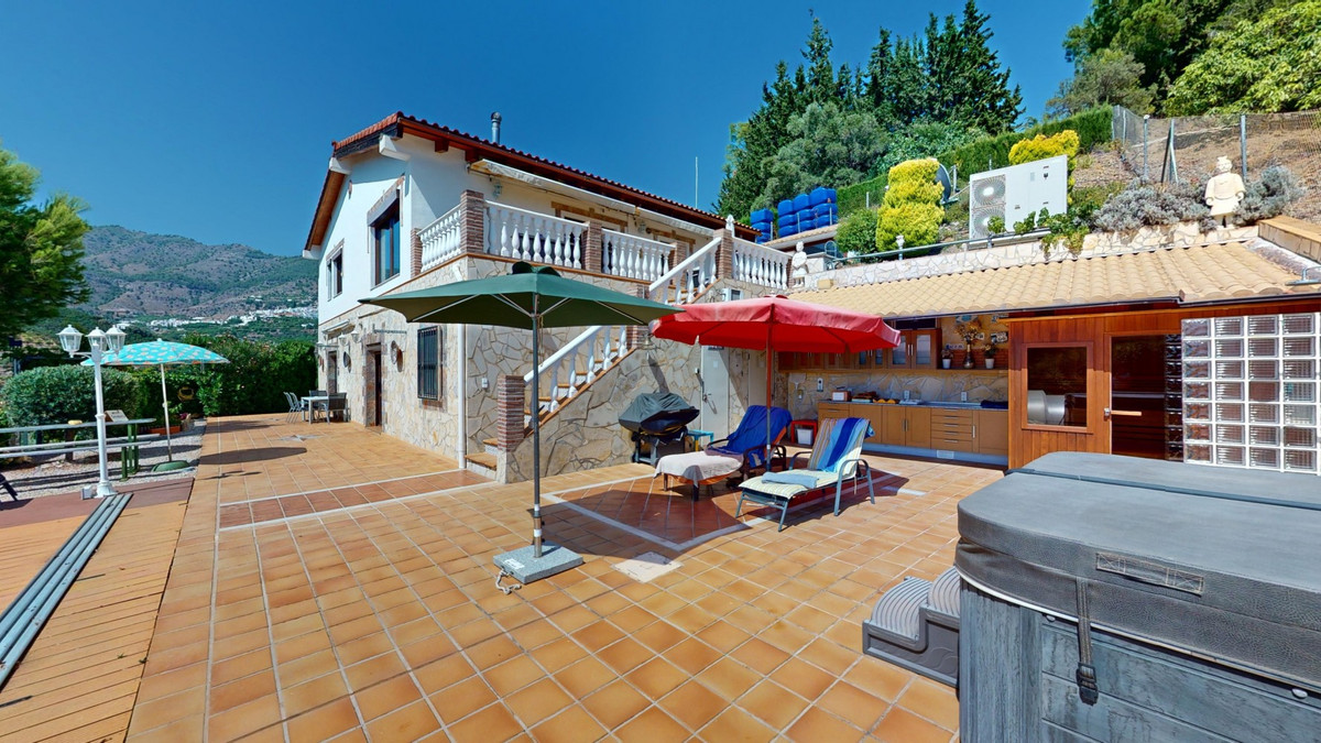 Stunning Villa Below Frigiliana for Sale. This impressive villa, nestled below Frigiliana, offers two separate living units across two floors, each with its own driveway and privacy. The upper unit spans 150 m2 and features a spacious open-plan living and dining area with an adjoining kitchen and convenient storage space. From the terrace, enjoy breathtaking views of the surrounding mountains. A standout feature of this apartment is the rotating fireplace in the living room, adding warmth and ambiance. Additionally, the terrace accommodates a fitness room. Another highlight is the luxurious bathtub in the living room, perfect for relaxing moments. The unit comprises three spacious bedrooms, two bathrooms (one en-suite in the master bedroom), and a guest toilet. The lower unit includes a cozy living and dining area with a kitchen, one bedroom, and a bathroom, totaling 80 m2 of living space. The entire house is equipped with underfloor heating, air conditioning, and a central vacuum system, built to the highest German standards with excellent insulation and quality materials. A solar panel system on the roof provides heating and hot water. The outdoor area of this exceptional villa leaves nothing to be desired. There is a heated saltwater pool with an easy-to-operate cover, a relaxing jacuzzi, and a fully equipped outdoor kitchen with a sauna. Additionally, there is a workshop, a caravan, and another small building at the foot of the property. The 6000 m2 plot is adorned with numerous fruit trees, inviting nature lovers to linger. The villa boasts good connectivity and is perfect for those who appreciate a tranquil lifestyle amidst nature. Experience luxurious living in a breathtaking location your new home below Frigiliana awaits! We are pleased to be able to present this dream property to you soon, either personally or via virtual viewing. Because this world is unique - just like our Axarquía. In Andalusia. On the Costa del Sol. Here, on the sunny side of life...