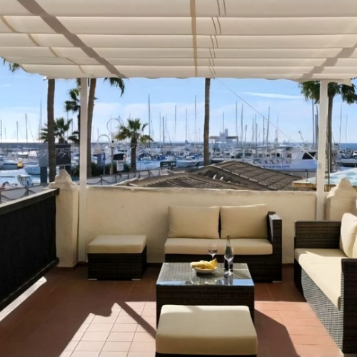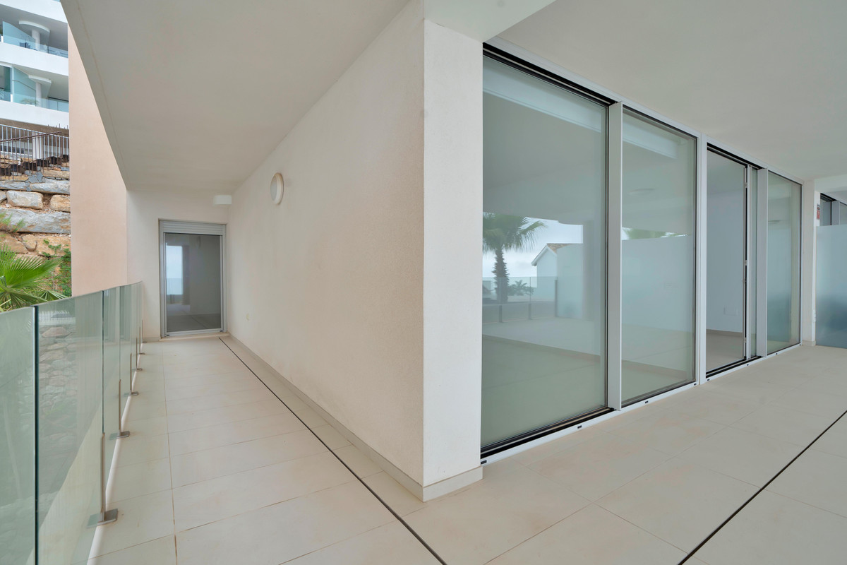 The property features a bright and spacious living/dining area with large windows and access to a vast, serene terrace. The living area offers beautiful sea views from the inside. The large L-shaped terrace surrounding the apartment provides stunning panoramic sea views and generous space for relaxing and outdoor dining.