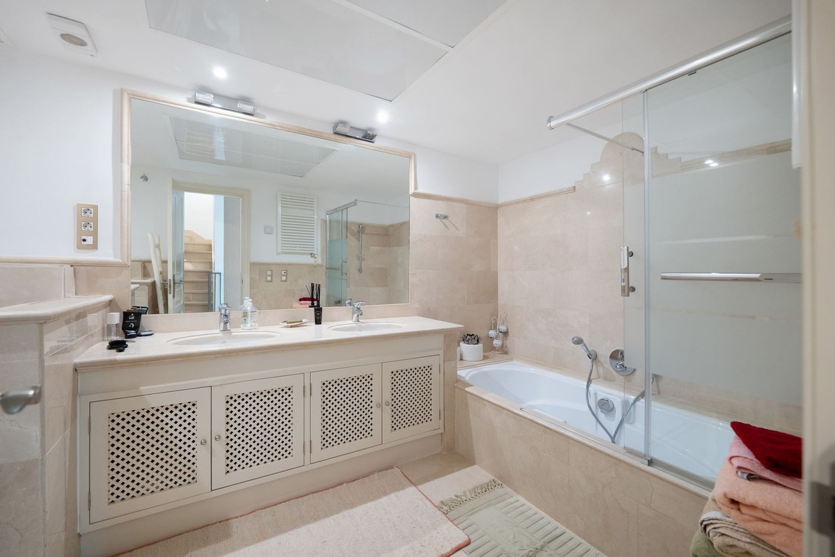On the ground floor, you'll find a spacious living room with a fireplace and large terraces that lead to a private, well-maintained garden. The kitchen is fully renovated and modern. There's also an entrance hall with a small closet and a guest toilet.