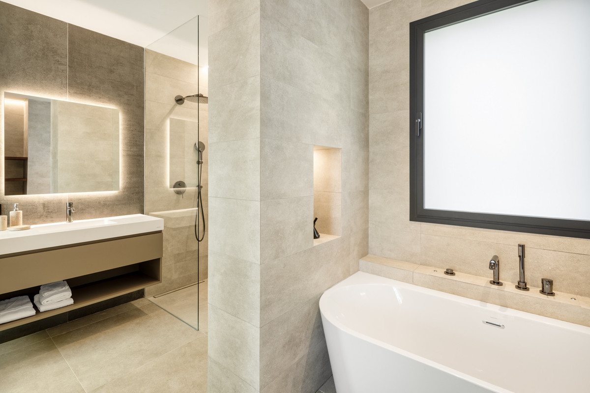 Sustainability is integral to the villa's design, with pre-installed solar panels and user-friendly home automation systems accessible via smartphone. The residence includes zone-controlled underfloor heating and high-end Gaggenau kitchen appliances. Bathrooms are outfitted with premium Villeroy & Boch and Grohe fixtures. The salt-chlorinated infinity pool provides a serene retreat. Advanced technology includes pre-installations for curtain motorization and versatile TV placement options in designated entertainment areas.