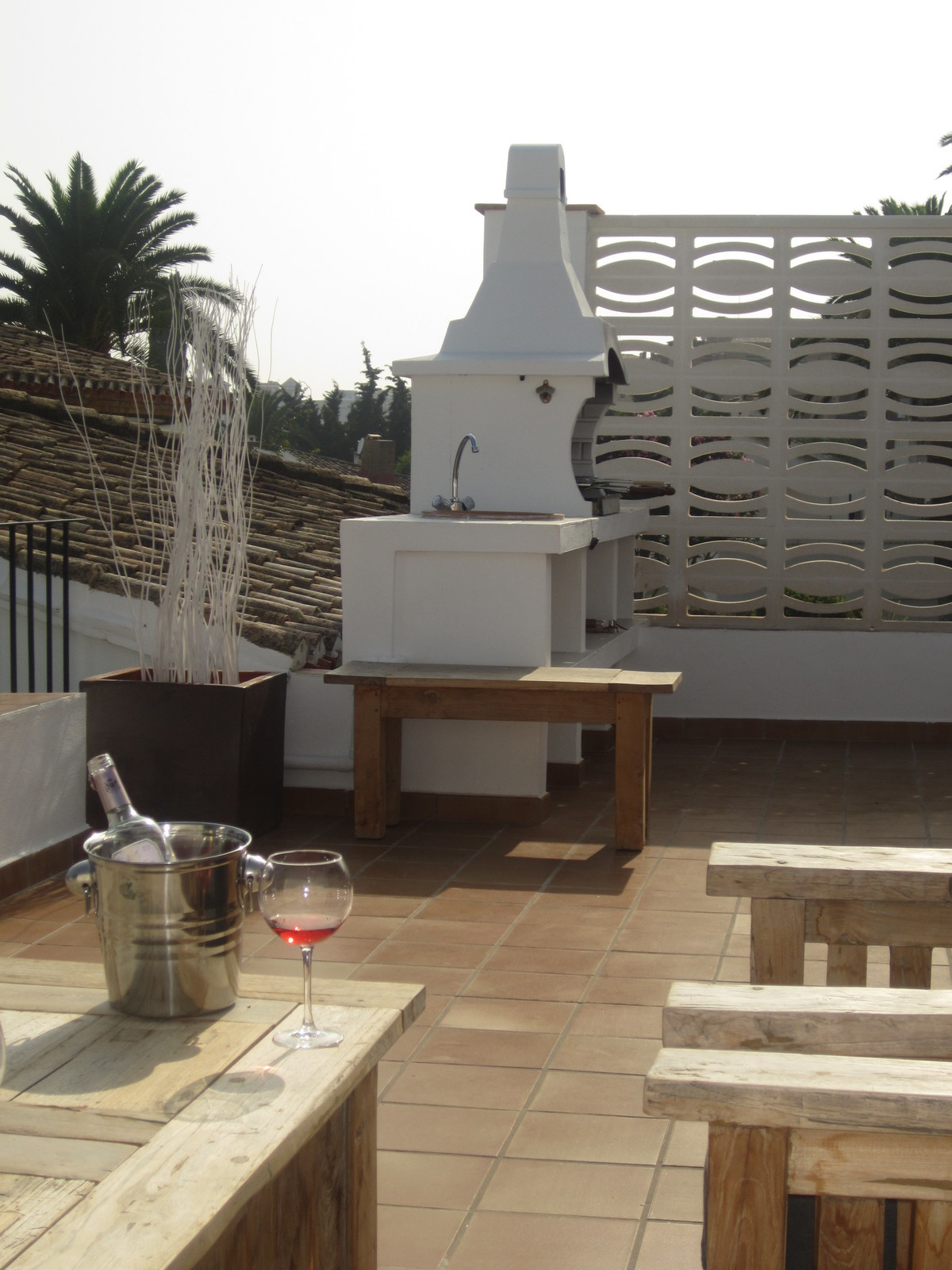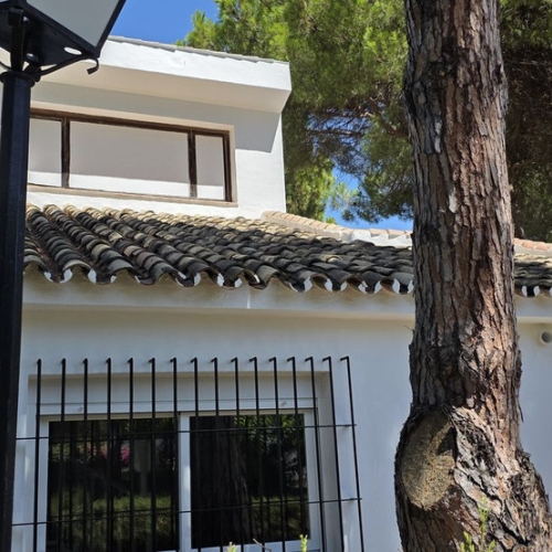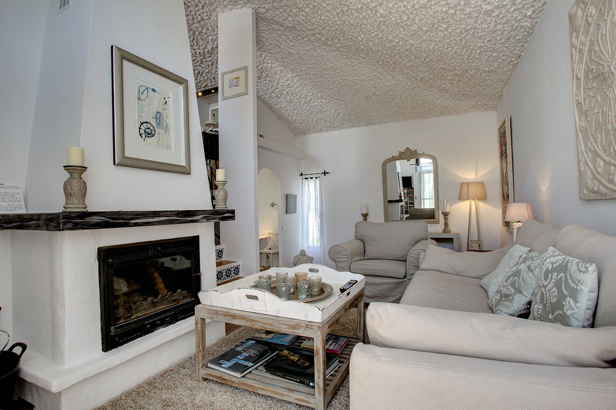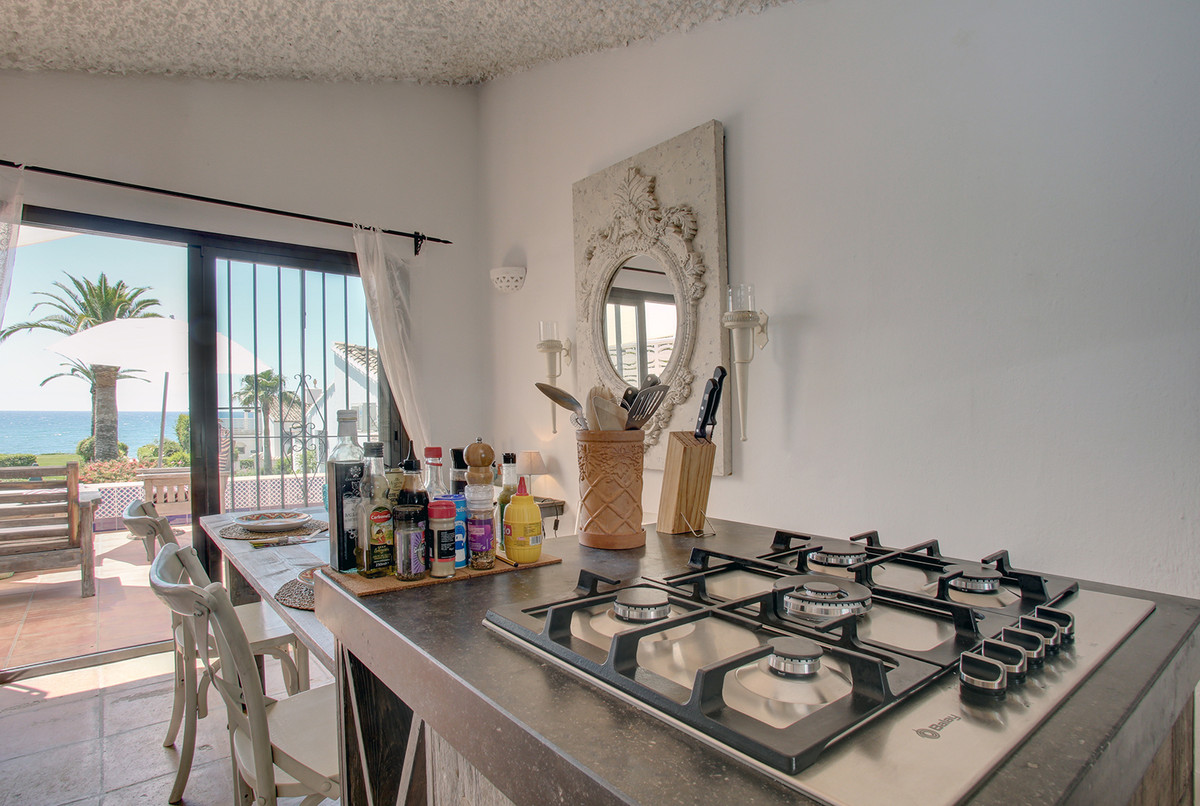 Very charming 3 bedroom / 2 bathroom townhouse with spectaculaire sea view in a securely gated beachfront resort with a large communal pool, subtropical gardens and direct access to the beach (only 50 steps to the beach!). The resort was built in 1969 and is located at the entrance (East) of Estepona, near the Palacio de Congresos and the large Supermercado Carrefour. The house has a private garden and a large terrace (50m2)with a lounge area, a built-in BBQ and a large dining table. From the terrace you have a wonderful view overlooking the Mediterranean sea. The fully fitted (new) kitchen is well equipped with American fridge/freezer, oven, microwave, 5 ring stove and dishwasher. The split level living-room has a seating area with a fire place and a flat screen TV, plus an office corner. All bedrooms have airconditioning and have direct access to the private garden. The Carrefour, several beachbars, a fresh bakery, a pharmacy, a hairdresser are all within short walking distance. Estepona old town is a 15 min walk. Popular places like Puro Beach club, Puerto Banus, Los Flamingos Golf Club, Marbella are all within a 5 - 15 min drive.