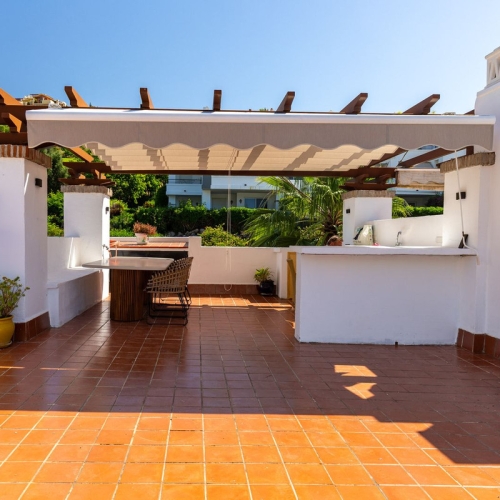 Rymlig takvåning i Benahavis med följande planlösning. Entréplanet har ett vardagsrum med öppen planlösning som leder till en terrass med utsikt över poolen och byn. Det moderna köket är fullt utrustat med toppmoderna vitvaror och extra förvaring.