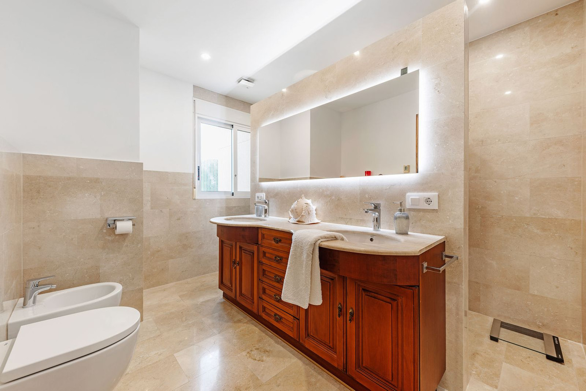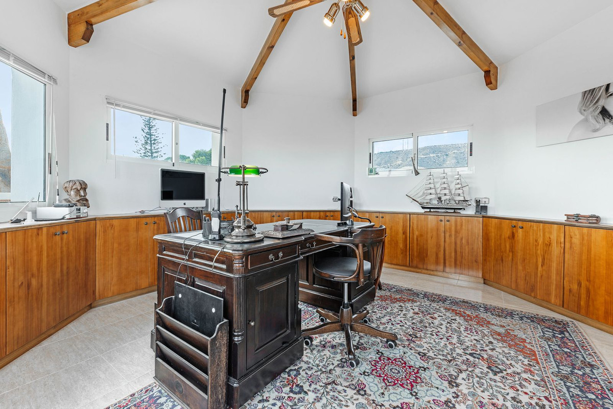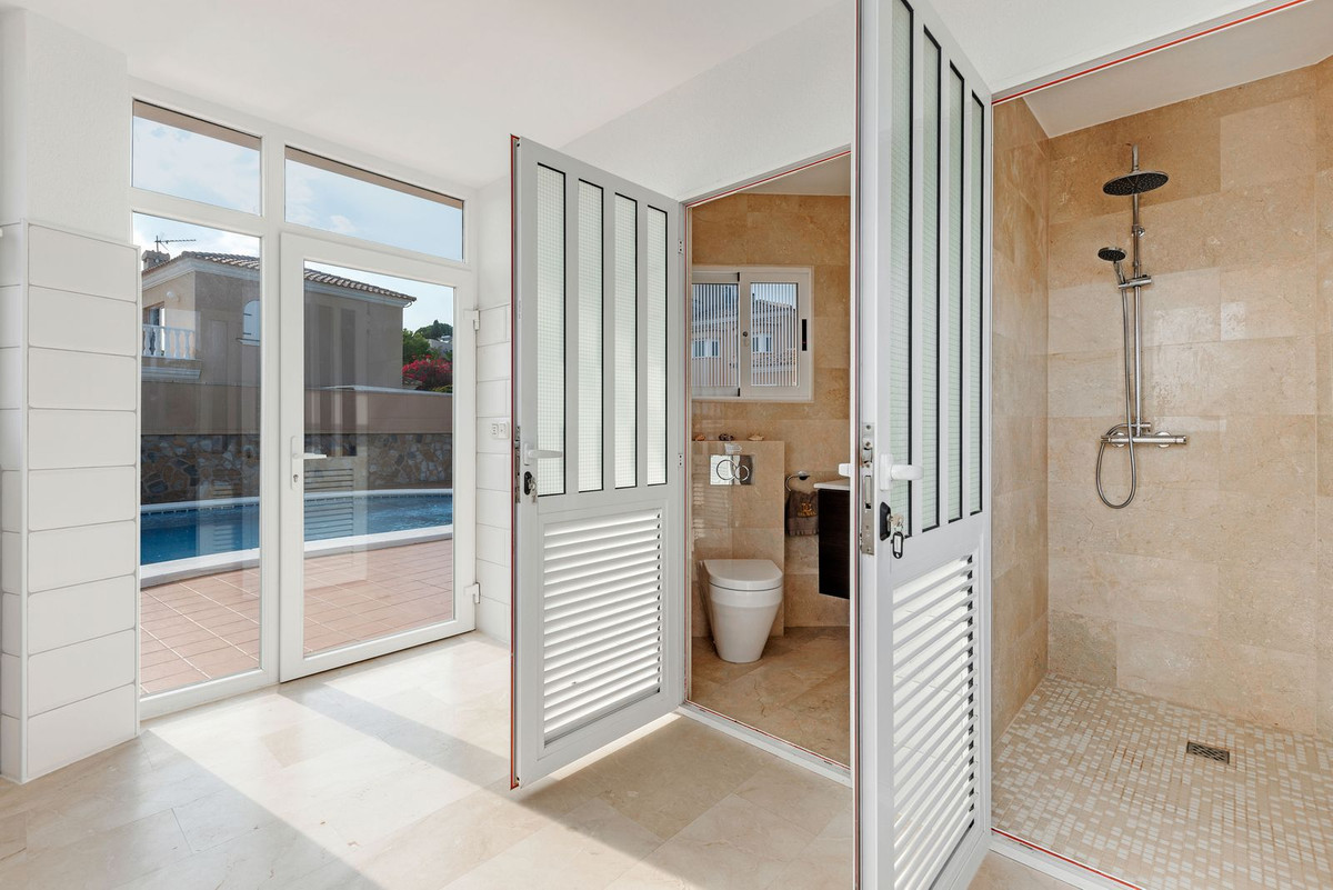 Upper Floor: The master suite is an oasis of luxury, featuring a generous living area, a walk-in closet, and a lavish en-suite bathroom with double sinks. The suite opens directly onto a terrace with captivating sea views. Three additional double bedrooms, one with an en-suite bathroom, are located on this floor, along with a separate bathroom serving the other two bedrooms. Every room on this level enjoys stunning vistas of the surrounding natural beauty.