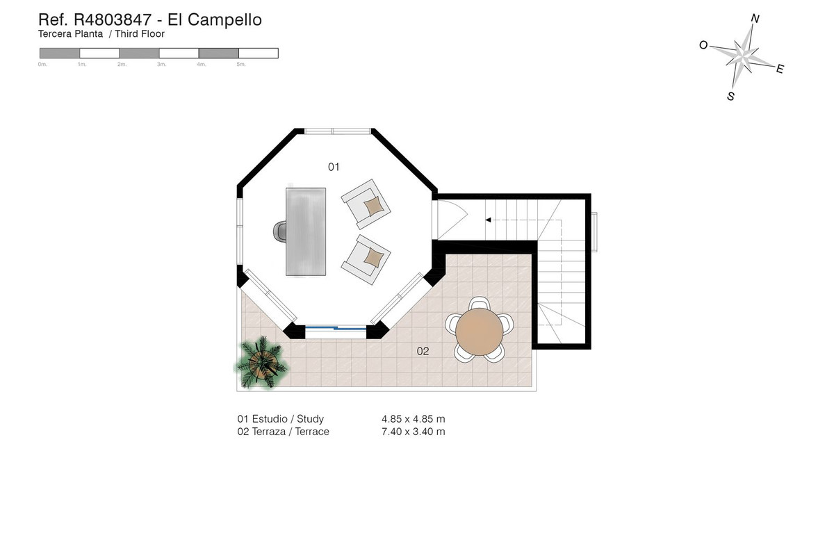 Top Floor: At the pinnacle of the villa, the octagonal study/observatory offers the finest views of the property, with a private terrace that invites peaceful moments of reflection or a tranquil work-from-home setting.