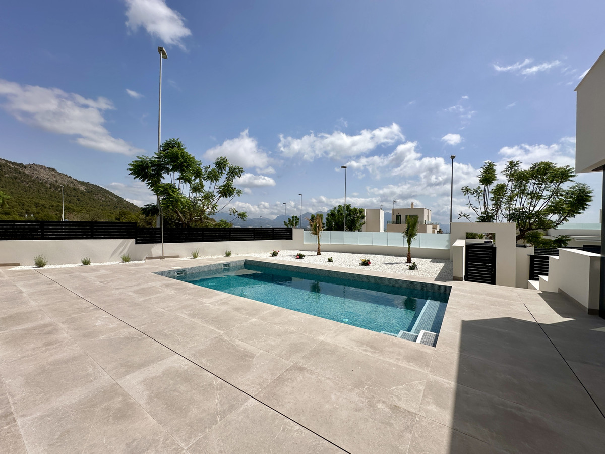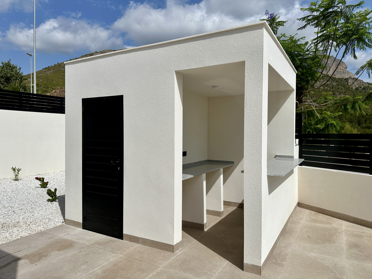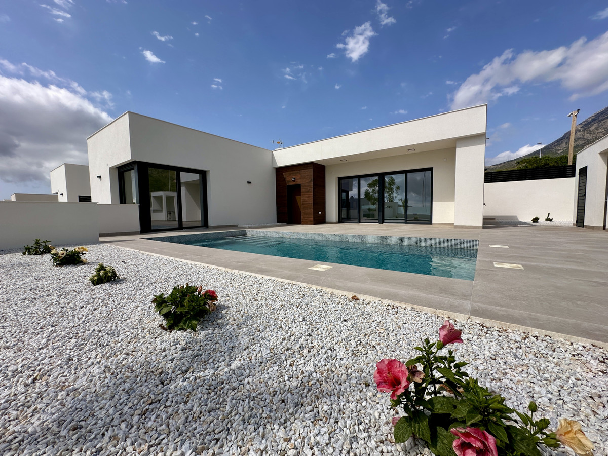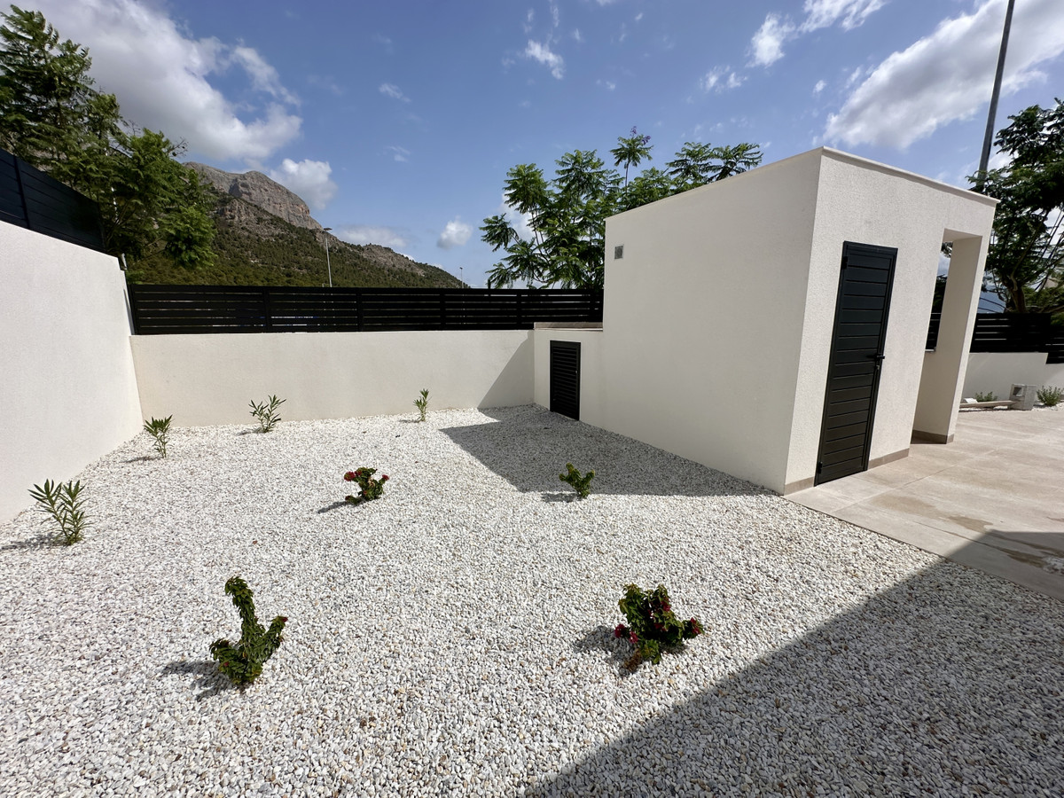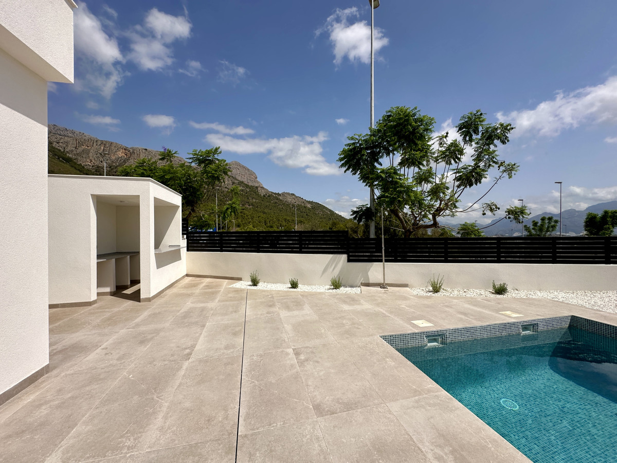 A single-family house distributed on ground floor and basement, with a total size of 220 square meters, with 430 square meters corner plot, located in "La Alberca" neighbourhood, in Polop de la Marina. Its "L" design allows a great use of sunny hours and the fantastic Mediterranean climate, providing light in all rooms of the house and lovely views to the mountains.