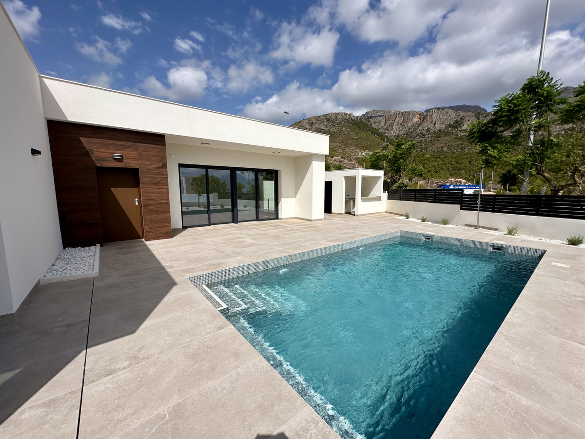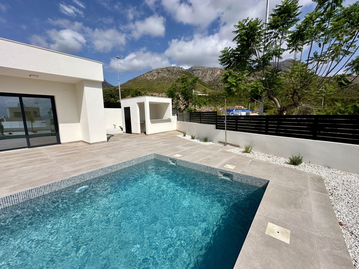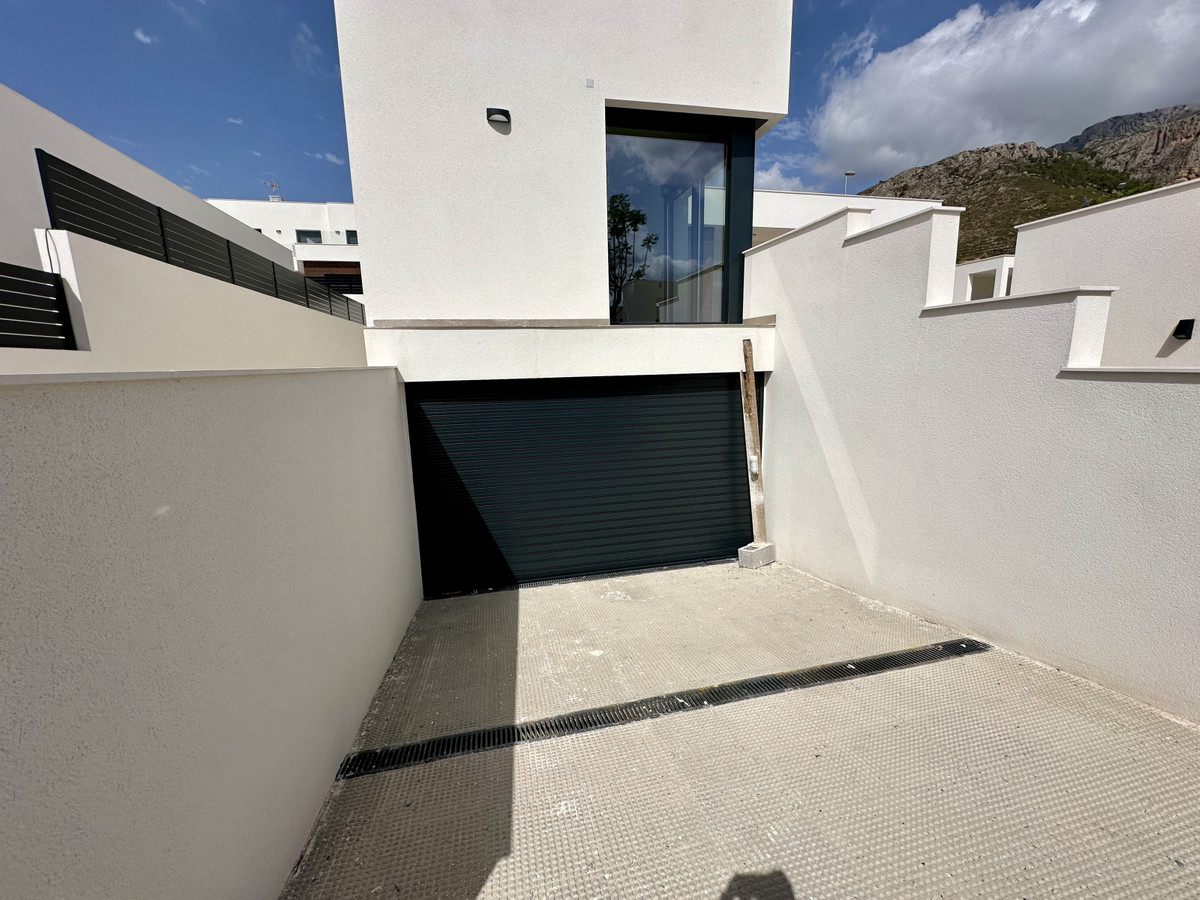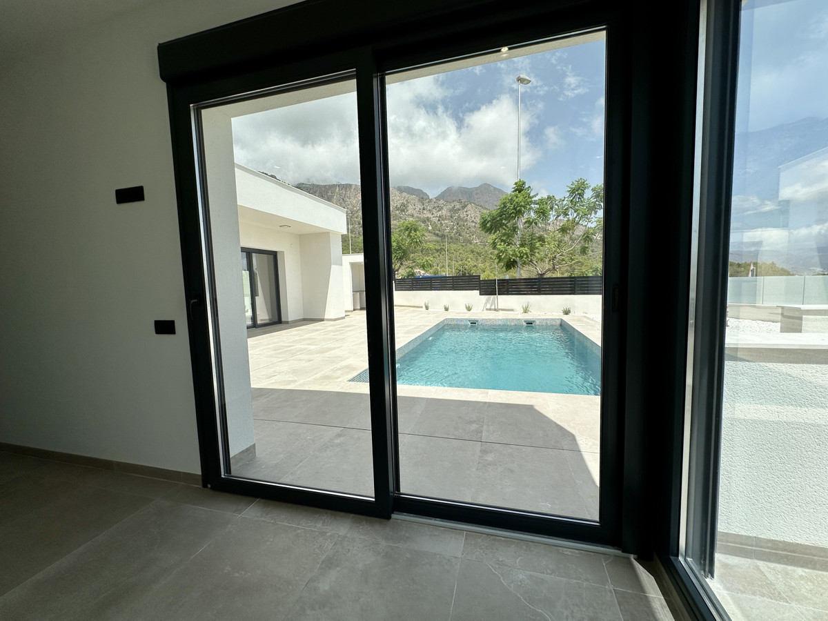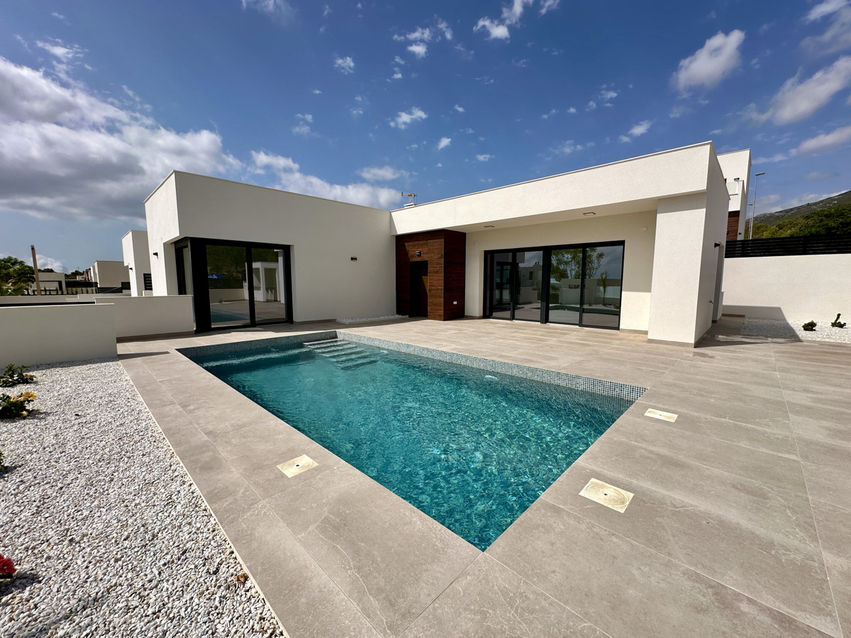 A single-family house distributed on ground floor and basement, with a total size of 220 square meters, with 430 square meters corner plot, located in "La Alberca" neighbourhood, in Polop de la Marina. Its "L" design allows a great use of sunny hours and the fantastic Mediterranean climate, providing light in all rooms of the house and lovely views to the mountains.