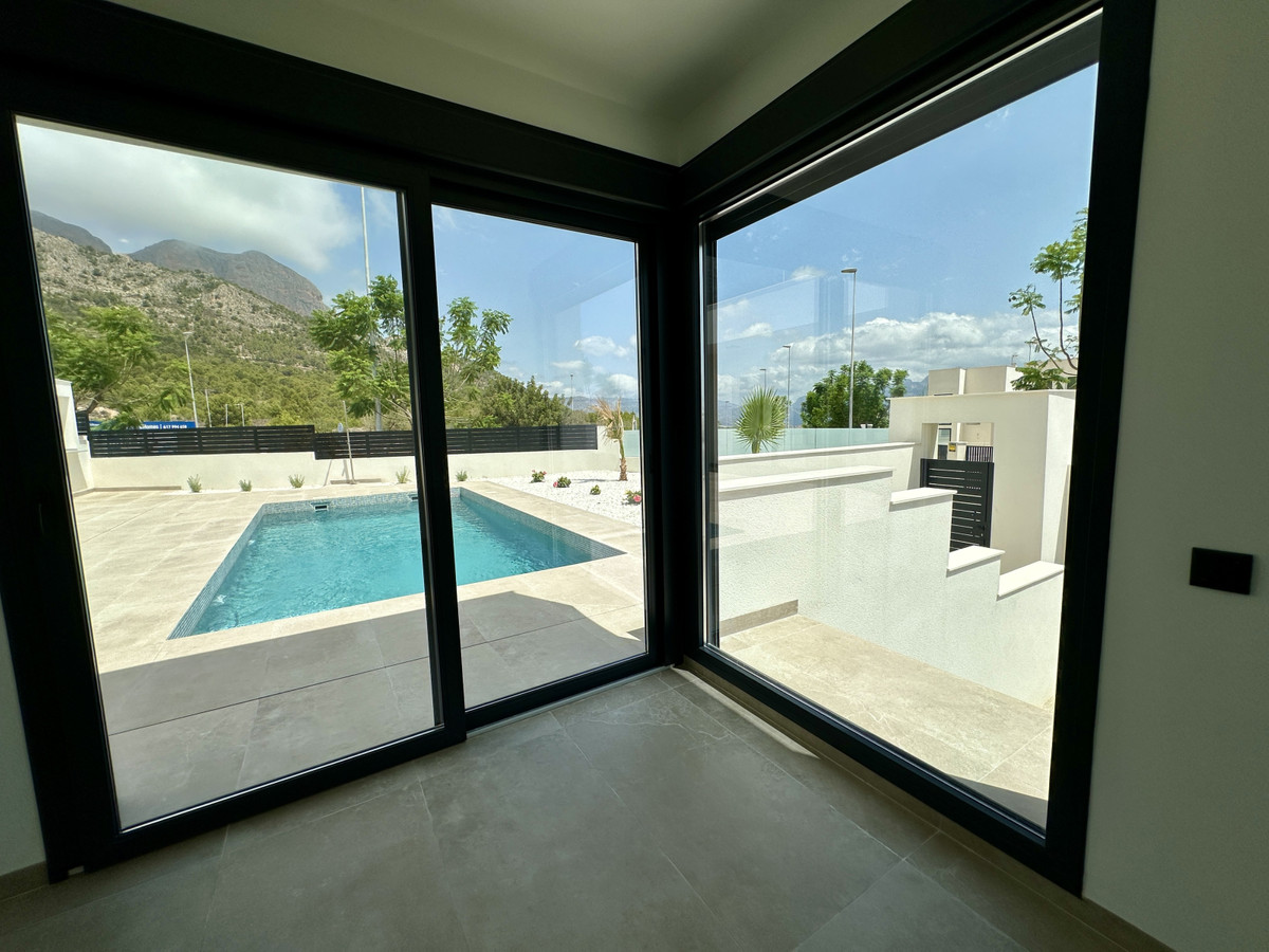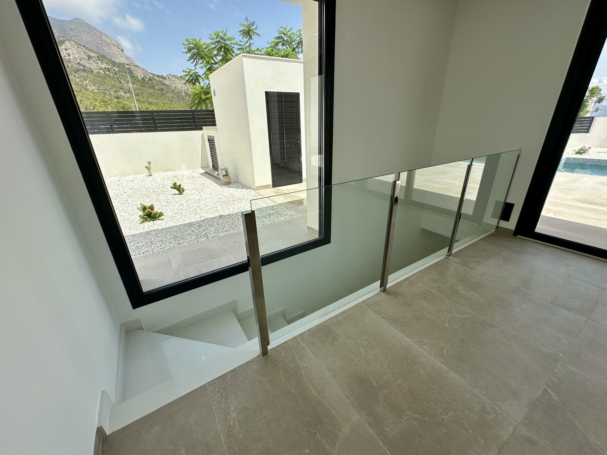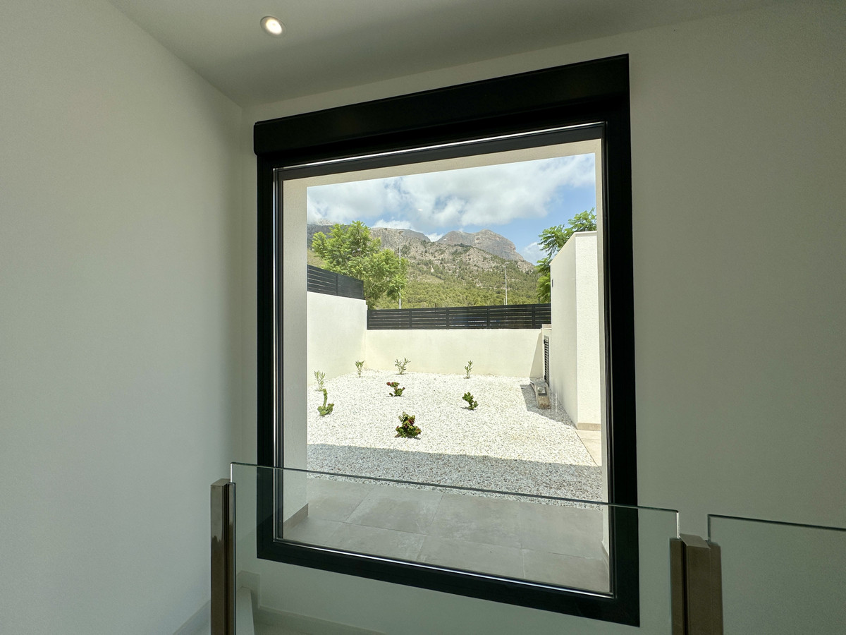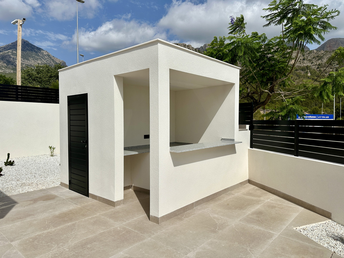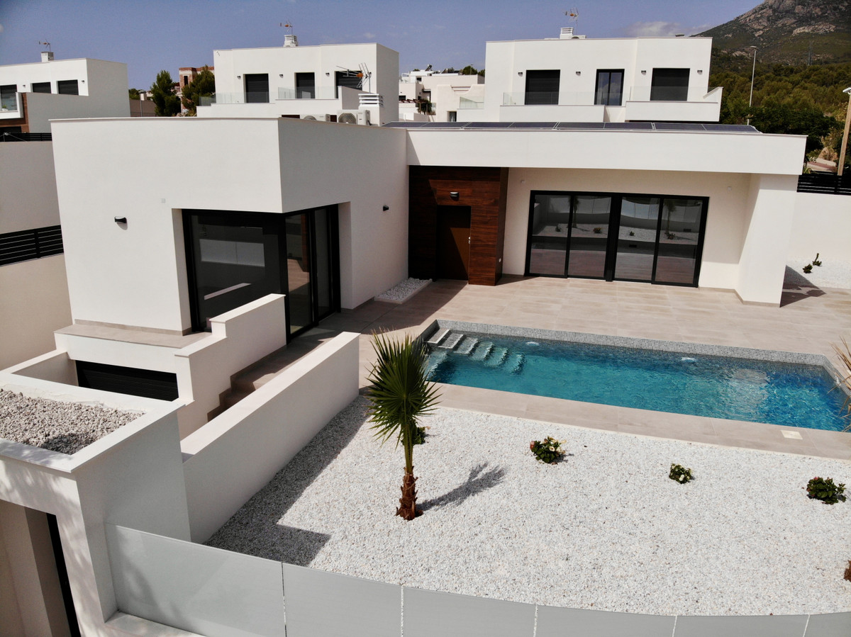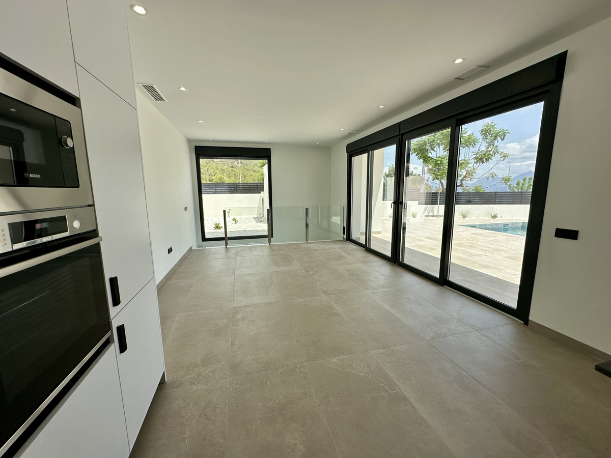 A single-family house distributed on ground floor and basement, with a total size of 220 square meters, with 430 square meters corner plot, located in "La Alberca" neighbourhood, in Polop de la Marina. Its "L" design allows a great use of sunny hours and the fantastic Mediterranean climate, providing light in all rooms of the house and lovely views to the mountains.