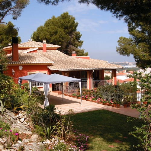 Impressive villa in one of the most quiet and pleasant areas of Denia, with stunning views of the Montgó Natural Park and sea views. The property is fully conditioned and ready to move in. The property consists of a fully furnished main house of 250m2 with gas central heating and air conditioning, with 4 bedrooms, the master bedroom with toilet, living room with fireplace, kitchen, shower room and a bathroom of about 30m2 with hydromassage cabin, a tower with a bedroom and bathroom, and a studio with shower room. There is a pool house with a kitchen, a shower room and a storage room. There is also a covered area with a barbecue, 2 benches and a table, and a garage with a pergola. It has a plot of 2700m2 with access from two streets, completely private and fenced with large well-kept gardens, a well, several terraces with greenery and a private pool. And best of all, on the plot there is the possibility of building another house of 200m2. It is located 1 km from Denia and 2 km from the sea. In total the villa has 6 bedrooms, 5 bathrooms, 2 kitchens.