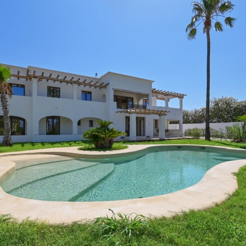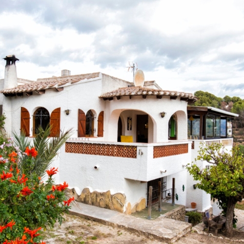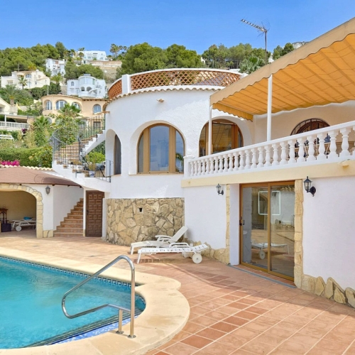 This traditional Spanish villa is located in a quiet area in Benissa a short distance from the coast. The ground floor comprises a spacious living-dining room, a fully equipped, modern kitchen and three double bedrooms, each with a private bathroom. The master bedroom is on the first floor and has a very spacious bathroom with sea views, a dressing room and a large terrace from where you can also enjoy the beautiful views of the Peñon de Ifach and the sea. Both the living room and all bedrooms on the ground floor have direct access through sliding windows to the spacious covered terrace. From the terrace you have views over the large swimming pool surrounded by a beautiful mature Mediterranean garden with several palm trees. On the other side of the villa is a large driveway with a carport and parking space for several cars. In the basement there is another laundry room and a storage room. The villa has underfloor heating, air conditioning, shutters, automatic irrigation and solar panels. In less than 5 minutes you reach the coast of Benissa where there are several idyllic beaches. In less than 10 minutes you reach the tourist port village of Moraira and in just 15 minutes you are in the lively seaside town of Calpe.