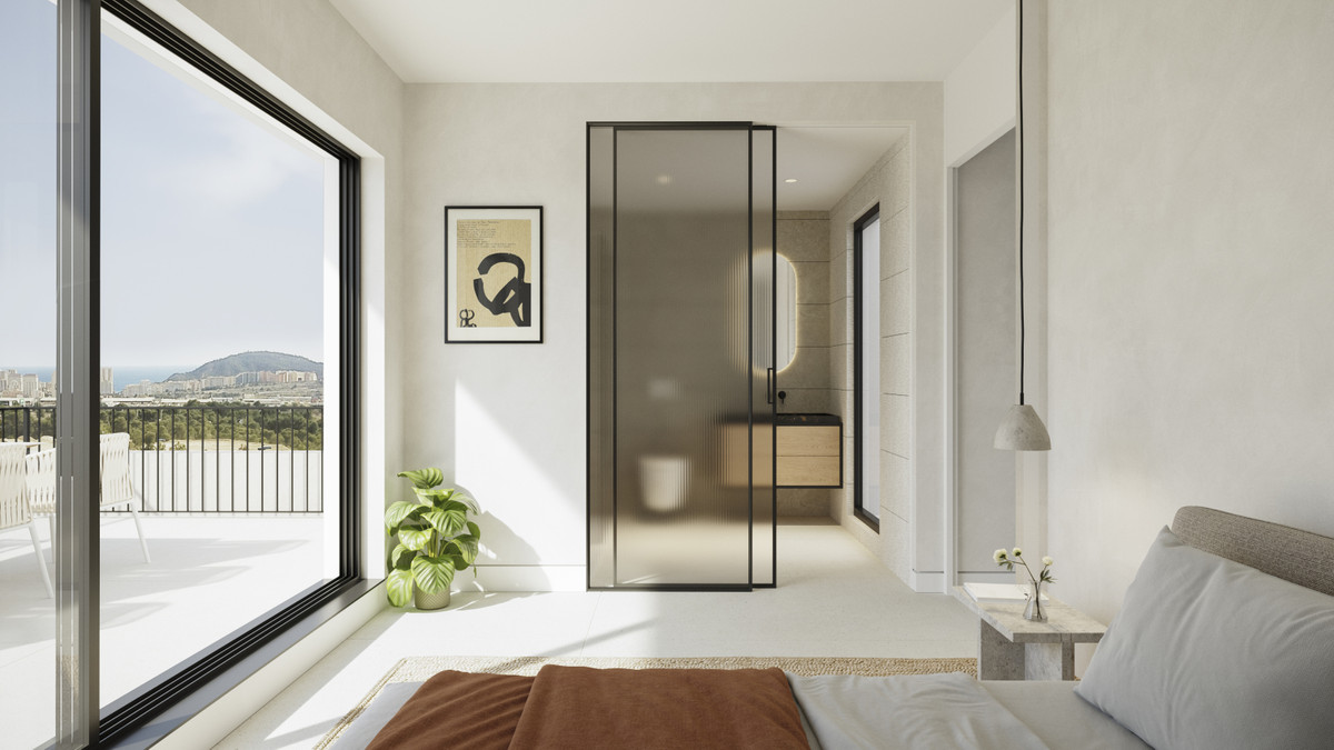 På andra våningen finns två sovrum med eget badrum och en generös terrass med panoramautsikt över Benidorm, havet och bergen.