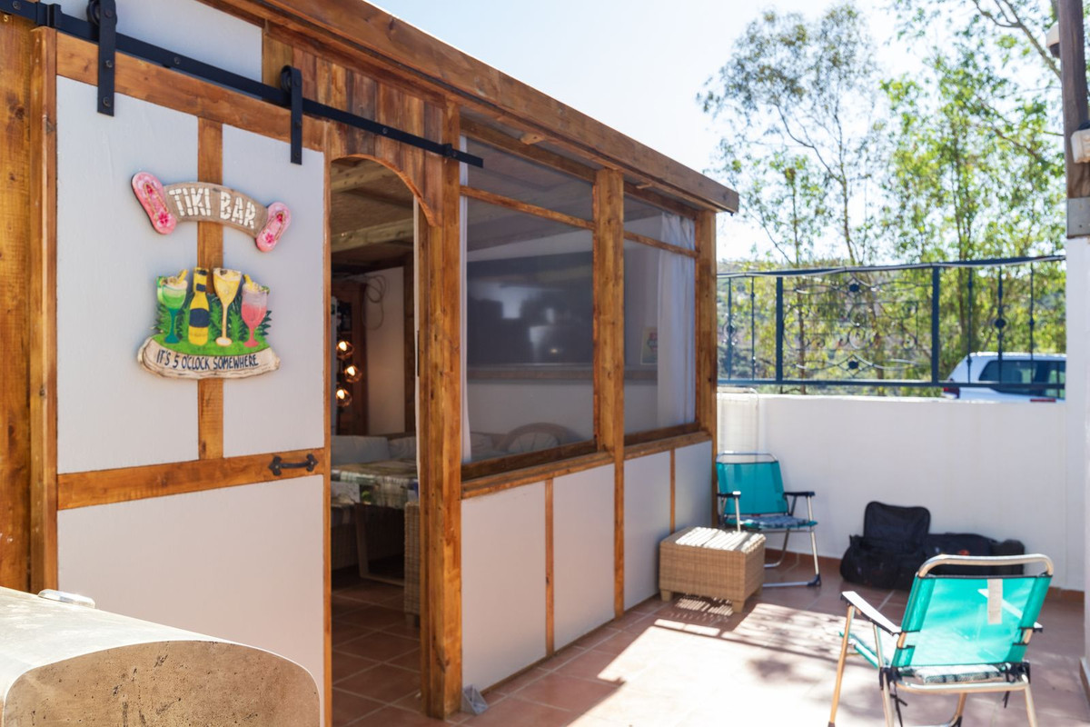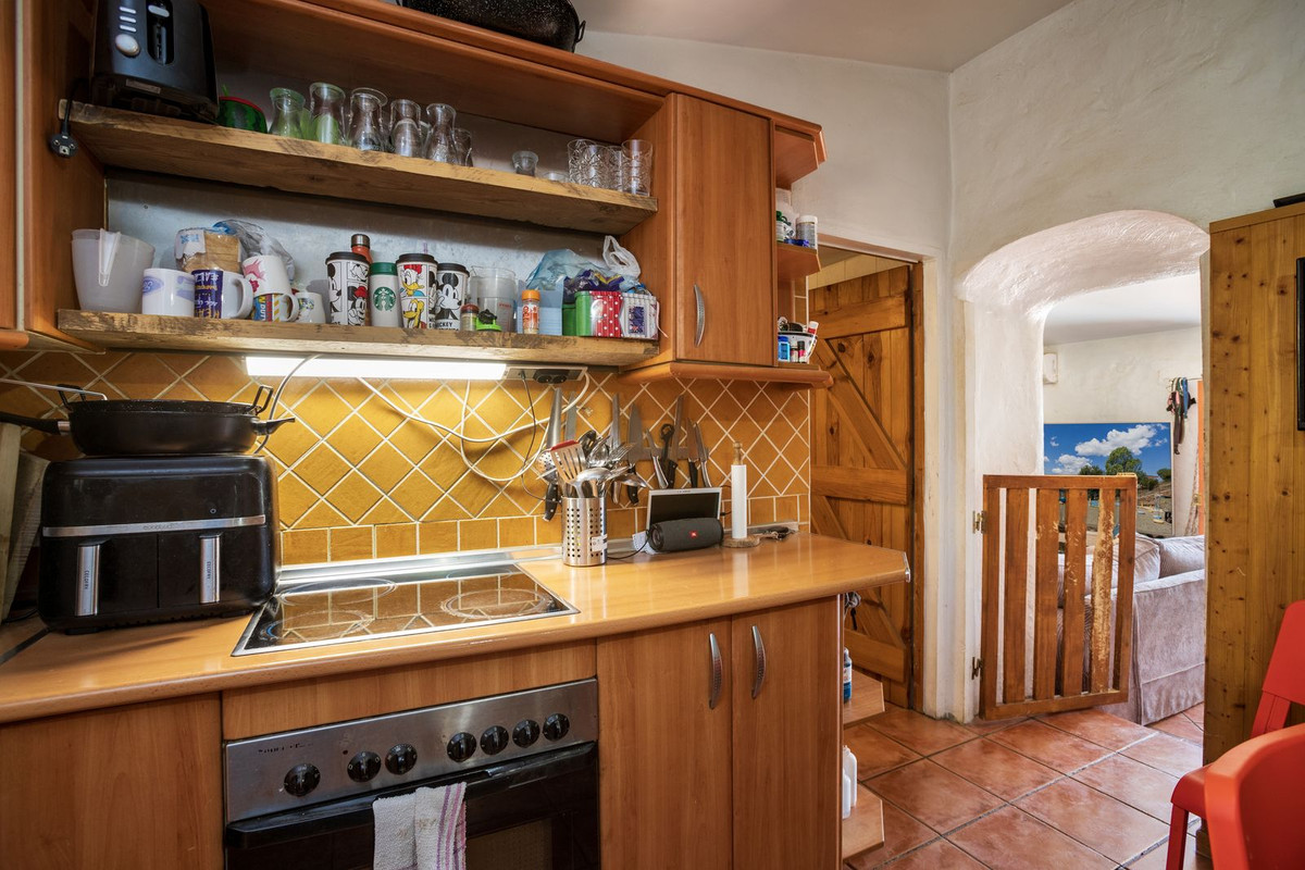 The second dwelling is a one-bedroom bungalow with open-plan living room and kitchen plus a good-sized bathroom. Beside it are a large store and extensive covered terraces, ideal for shaded outdoor living and practical day-to-day use.