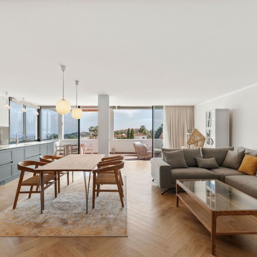 Detta är en 3-sovrums lägenhet på bottenvåningen. Inuti hittar du det toppmoderna köket med öppen planlösning med Gaggenau-apparater och ett öppet vardagsrum och matplats. Vardagsrummet har direkt tillgång till en spektakulär stor terrass med utmärkt utsikt över havet och bergen. Det finns en privat trädgård med jacuzzi på den. Alla rum har varit utsökt designade och färdiga till högsta standard.