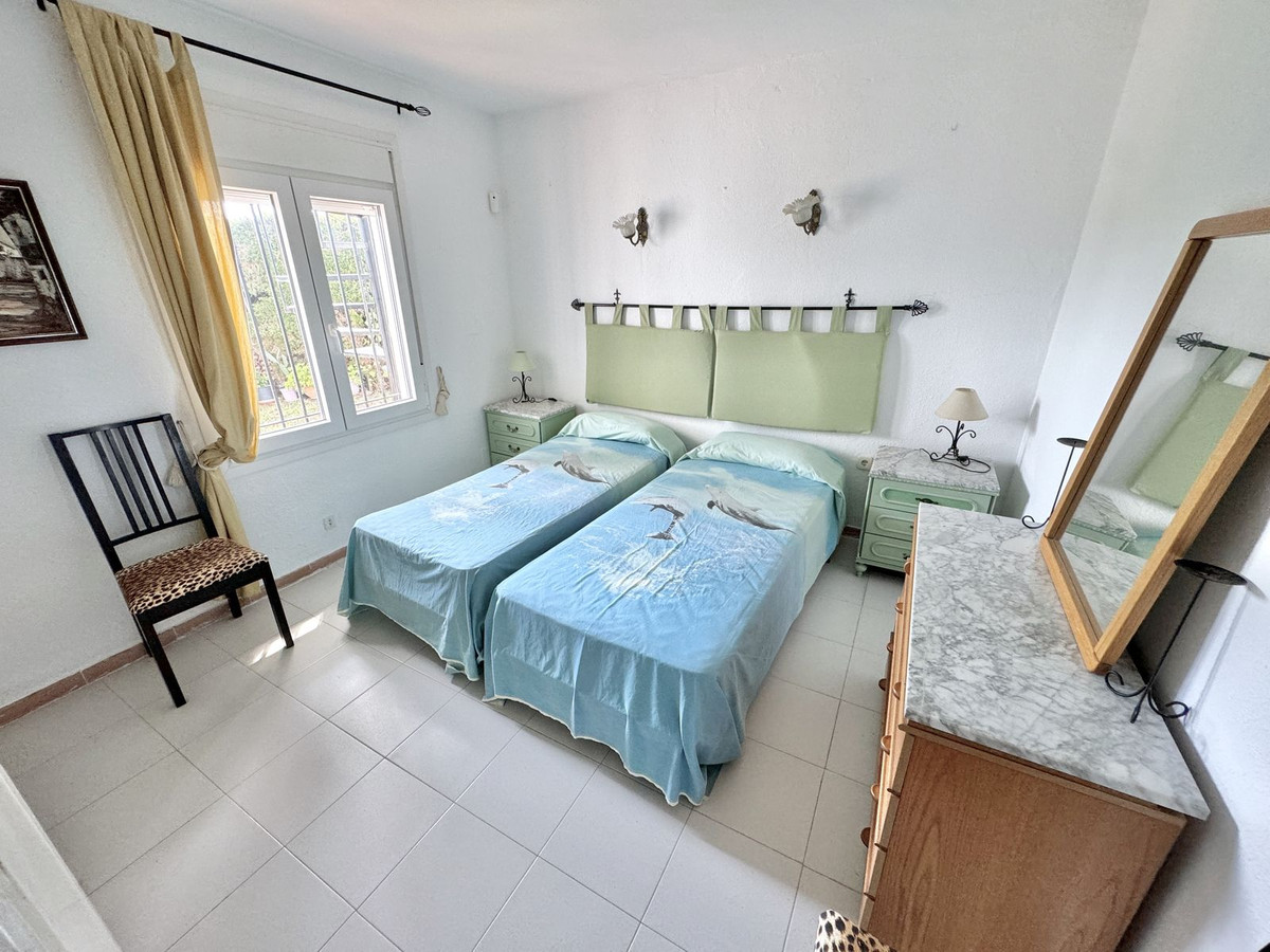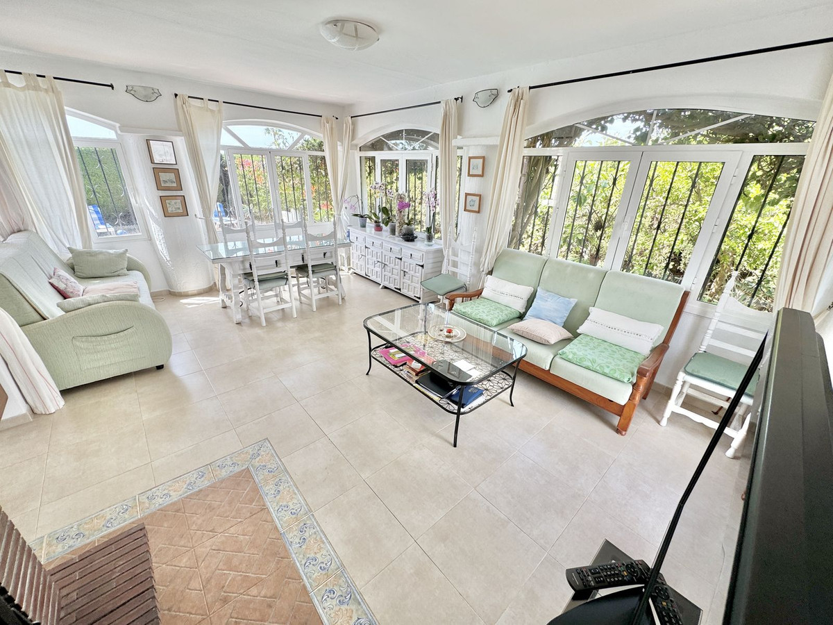 Denna charmiga och rymliga villa med 4 bäddar och 3 badrum erbjuder massor av andalusisk karaktär med 2 torn. Den har en ljus rymlig lounge full av fönster och en öppen spis. Ett trevligt kök/frukostrum som vetter mot en avkopplande skuggig täckt område förutom den soliga söderläge poolen med jacuzzi bubblor. Här hittar du också ett extra rum med ström och vatten med utsikt över poolen, som skulle bli ett fantastiskt kontor eller bar. Fastigheten har också ett separat garage, tvåglasfönster och luftkonditionering i vissa områden. Du kan gå runt hela villan med oöverblickbara trädgårdar åt alla håll, två takterrasser med havsutsikt och ett gömt tornrum också med härlig havsutsikt, perfekt för ett läs-/hobbyrum eller kontor.