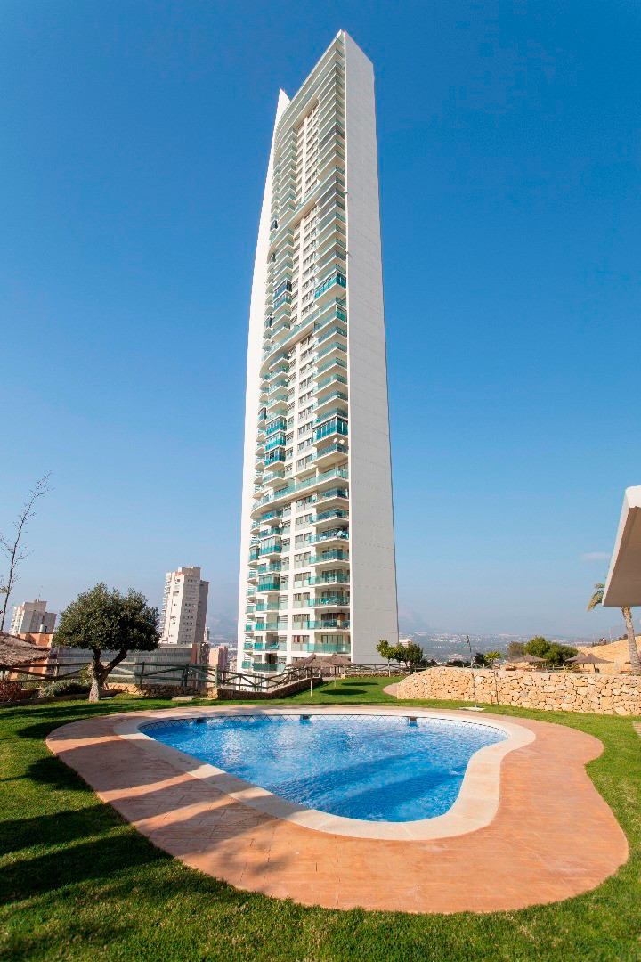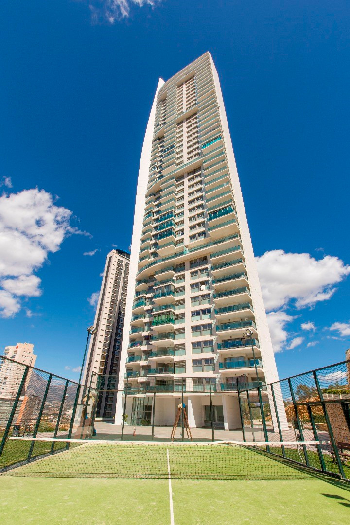 På 29:e våningen av Torre Lugano ligger denna lägenhet med fantastisk panoramautsikt över havet och staden Benidorm. Lägenheten har en yta på 89 m² med 2 sovrum, 2 badrum, vardagsrum och en stor terrass där man kan njuta av solen och utsikten. Det finns också 2 privata parkeringsplatser och 1 förråd inom byggnaden. Lägenheten är vänd mot söder. Den är mycket välvårdad och har en ny Daikin luftkonditionering med integrerat WIFI från år 2024. Byggnaden Torre Lugano är den 2:a högsta byggnaden i Benidorm med totalt 42 våningar och en höjd av 158 m.