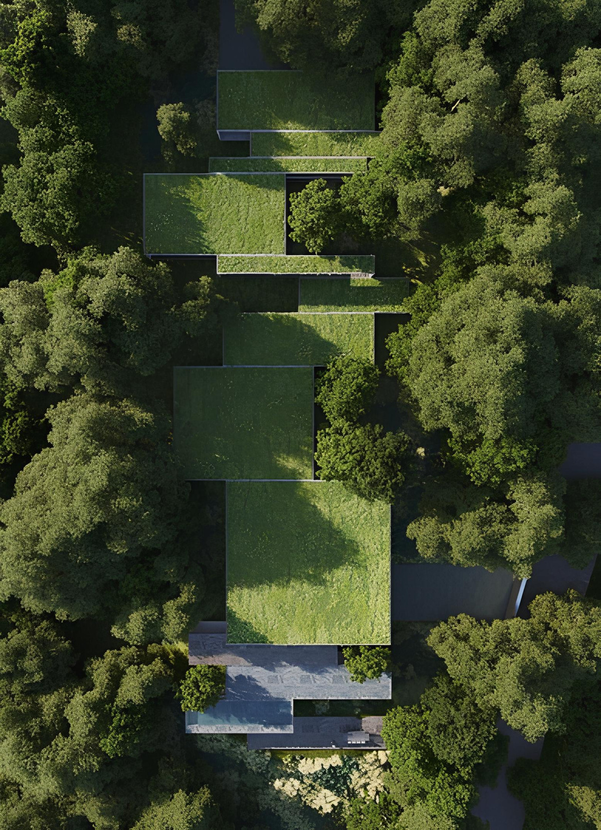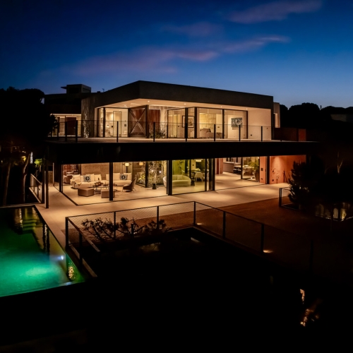 Villan omfattar 1 742 m² och flyter ner över tomtens 4 047 m² i ett enplansutförande, harmoniskt integrerat med naturen.