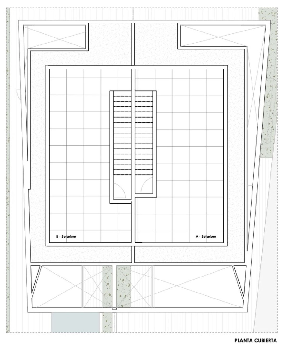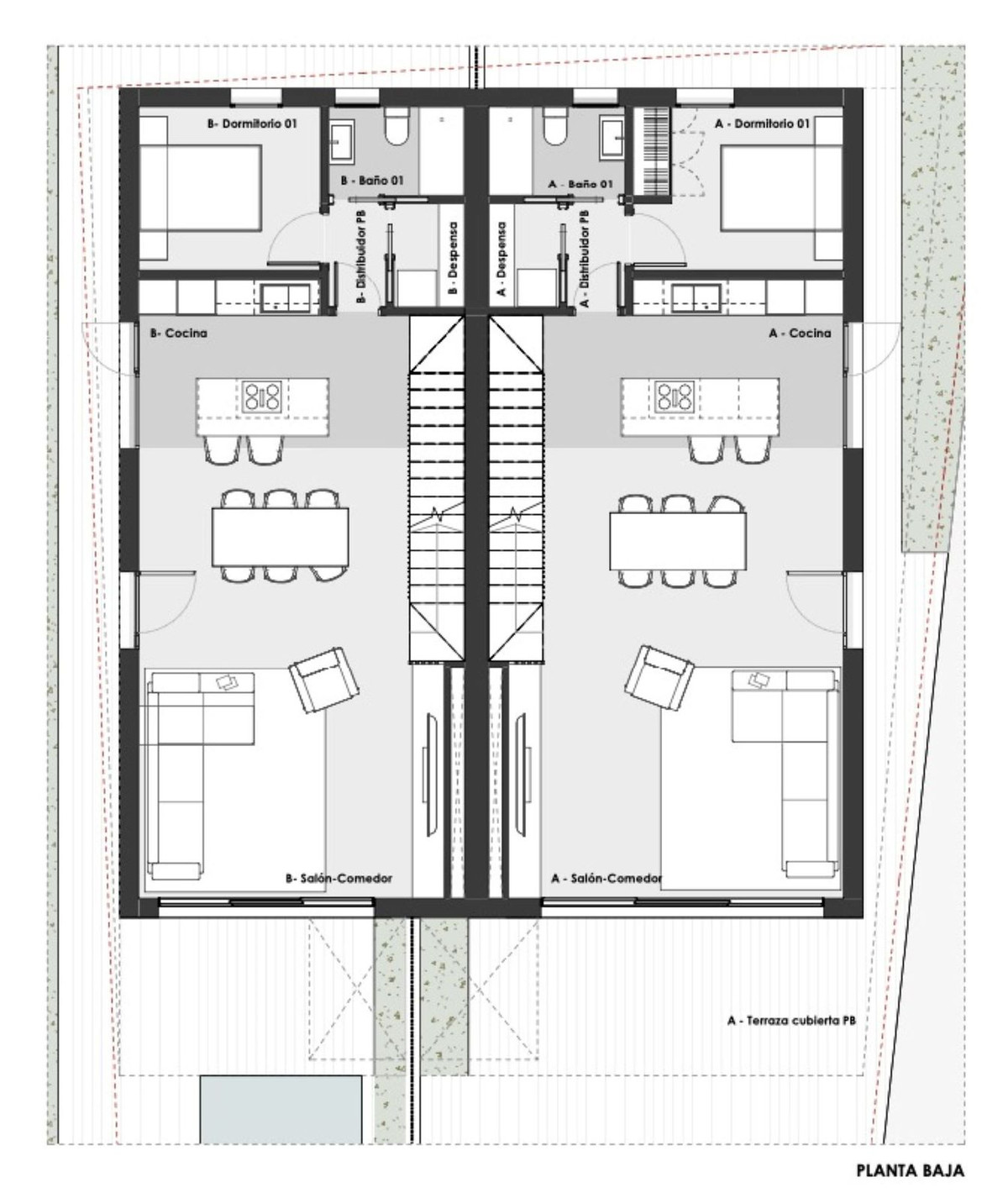 It offers a construction project for two semi-detached houses with four bedrooms, a garden and a swimming pool each. In addition, both houses will have three floors and a solarium