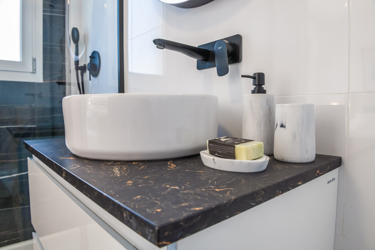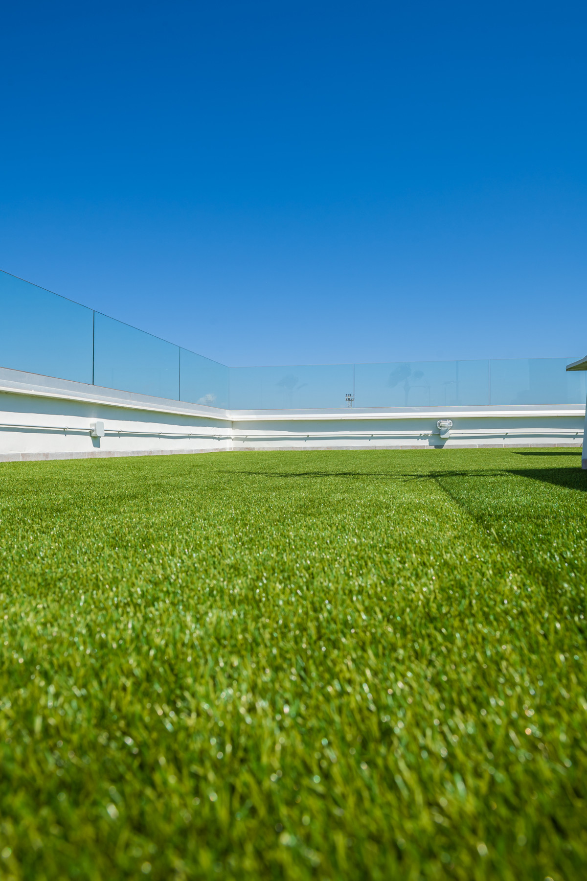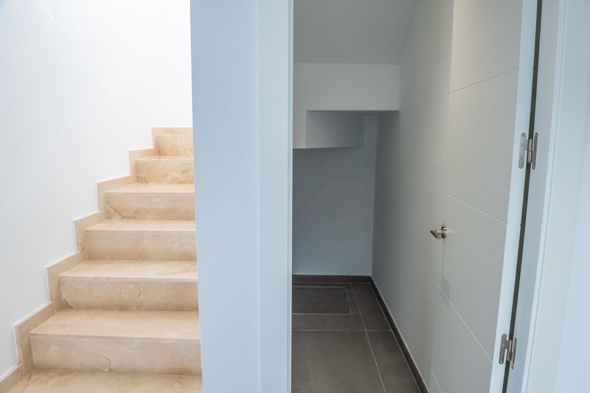 Bostad med 3 sovrum, två badrum, förråd och vardagsrum-matsal-kök med solarium på övervåningen och stängd garage på första våningen.