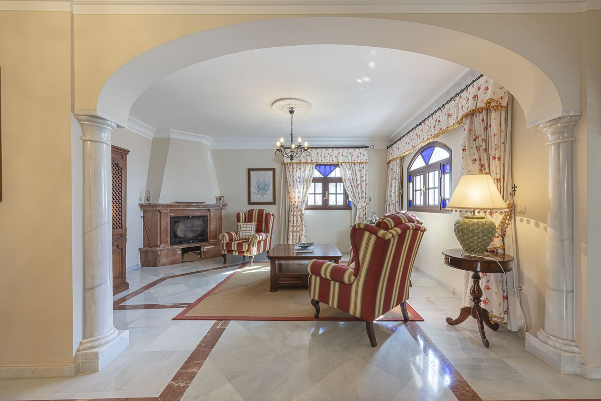 Spacious living room with fireplace and bar area, very bright thanks to large windows. Marble floors throughout the house and dimmable lighting create a cozy atmosphere.