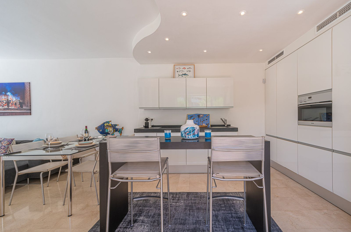 Beautiful one bedroom apartment in Alhambra del Mar on the Golden Mile of Marbella only 100m from the beach promenade and close to all amenities. The apartment consists of a spacious living-dining space with open American kitchen and direct access to a nice terrace with lovely views to the tropical garden of the complex. Furthermore there is a good size bedroom with bathroom and a small dressing area en suite. It is surrounded by the lush gardens and fountains of the Alhambra del Mar urbanization which evoke a permanent feeling of holidays and breathing space. With all amenities at hand and just a few metres from the beach, Capuccino and at walking distance to Marbella centre, the apartment offers an excellent location and a rare opportunity to live by the sea. Includes a good sized storage in the basement.