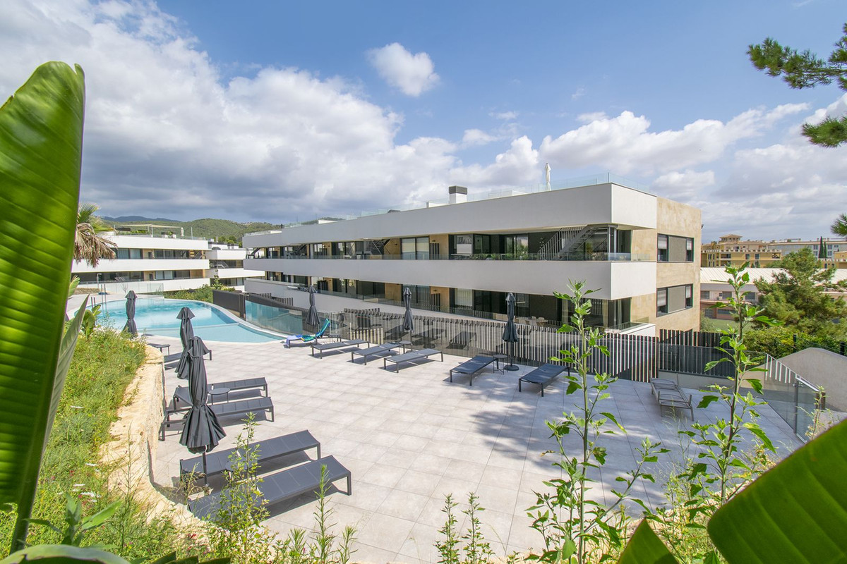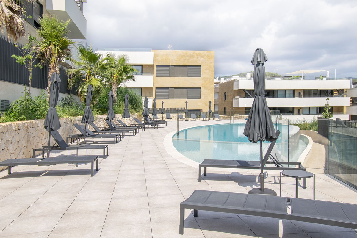 This fantastic ground floor apartment with garden in Palma is located in a very attractive location on the Son Quint golf course and in the immediate vicinity of the Son Muntaner golf course and is part of an exclusive residential complex with a communal pool. The rooms are generously distributed over a constructed area of approx. 105 m2. The spacious living room with conservatory gives access to the approx. 105 m2 terrace and the private garden. The open, modern kitchen with central bar and high-quality Dekton countertop is equipped with high-end appliances from Siemens.