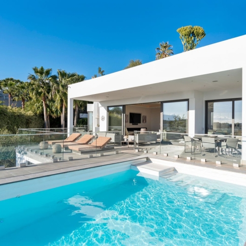 Villa TrueLove is a six-bedroom, five-bathroom luxury villa in the heart of Benahavís. It offers stunning mountain and garden views, combining modern technology with natural design. The home features a seamless connection between indoor and outdoor living, surrounded by lush gardens and an infinity pool. Every detail reflects elegance and peace, creating a private retreat for those who value space, beauty, and tranquility.