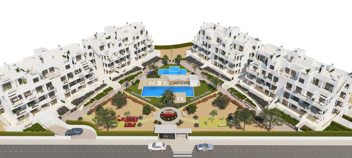Denna utveckling består av 60 lägenheter fördelade på 4 byggnader med terrasser för bottenvåning, första och andra våningen, gemensam pool, uppvärmd pool och solarium med sommarkök på takvåningarna för att njuta av solens strålar året runt.