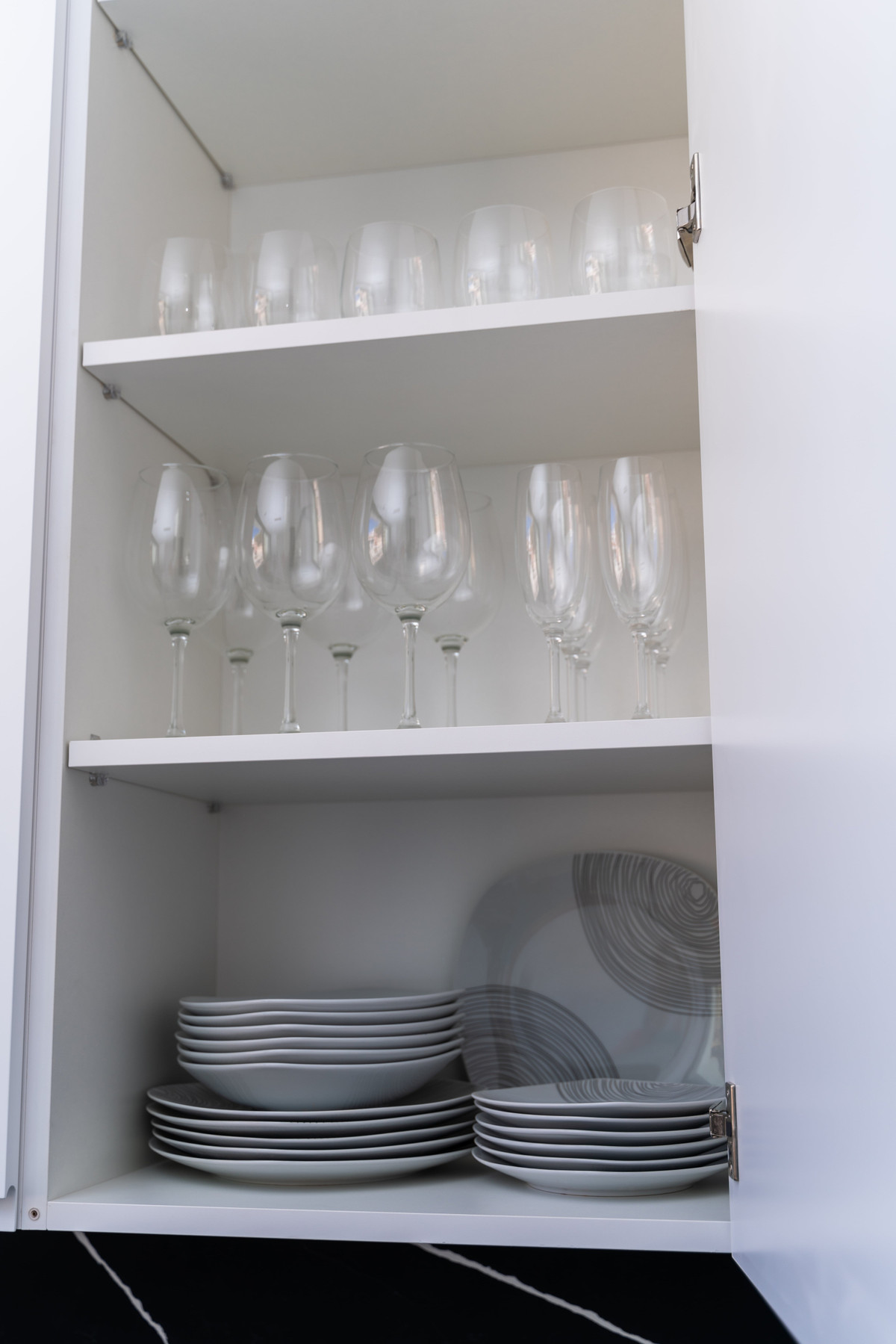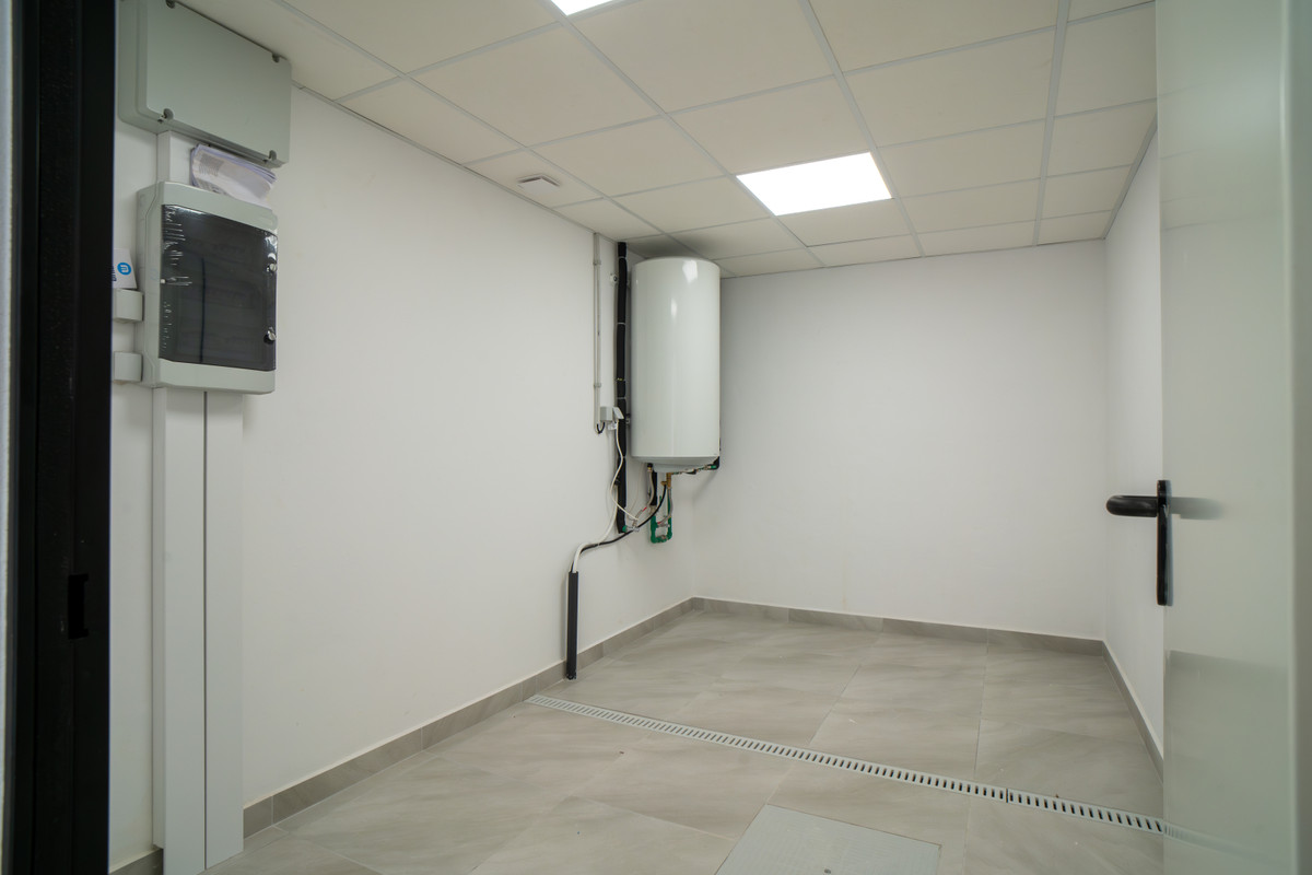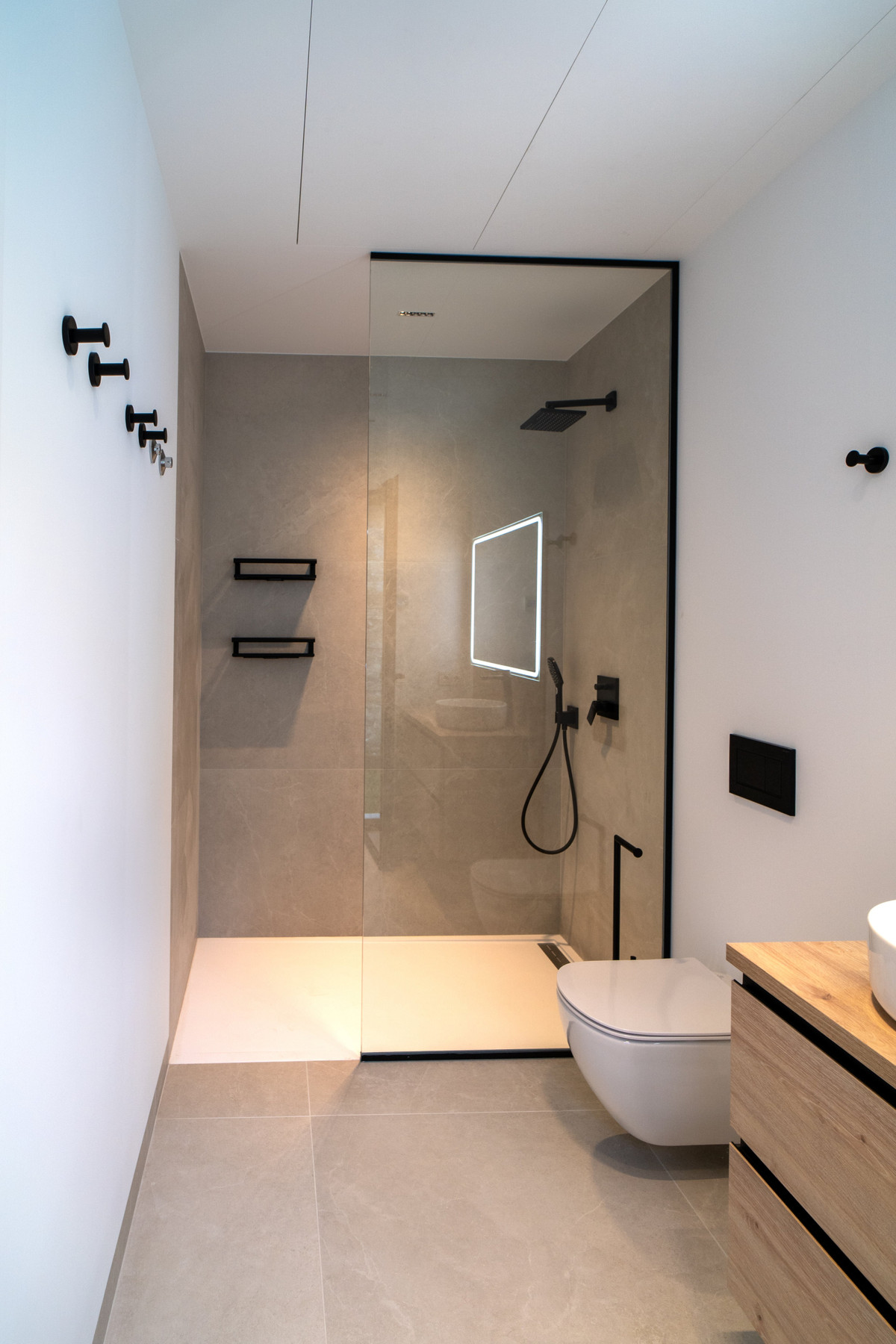 Each house has two floors. On the first floor: kitchen, living room, entrance area, master bedroom with dressing room and bathroom, two guest bedrooms with bathroom, guest toilet. On the ground floor: garage for two cars, laundry room, technical room, 50 square meters of space for free use, and a parking space for a golf car. The plot has a landscaped garden with paths, trees, and flowers.
