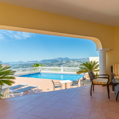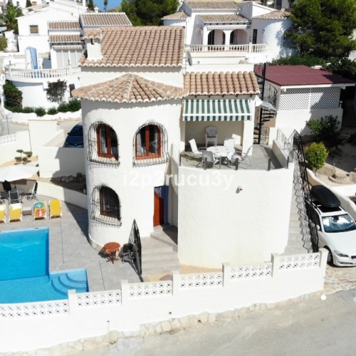 Relish in the tranquility of this wonderfull villa with it's stand-out feature, the astonishing close view of the shimmering blue sea, a breathtaking feature indeed. The villa is south-east facing, so you can enjoy those wonderful sunny views on the beautiful open terrace, while you're having a swim in the pool or testing you're cooking skills on the barbecue. If we step into the villa, we find an entrance hall, to the left is 1 double bedroom with an ensuite, the ensuite has a bath and a shower, it also has direct access to the terrace. To the right of the entrance hall, we find a guest toilet, the open kitchen with an induction hob and oven, an office space and a spacious dining/living room with a cozy fireplace, this room opens up to the large terrace with stairs going down to the pool area. Going down the stairs in the villa, we find the 2 other bedrooms both with access to the terrace, and a bathroom with a shower. All the bedrooms of this villa are equipped with built-in wardrobes and all have access to the terraces, the windows have double glazing and shutters. The garden is easily maintained with irrigation and it has some beautiful fruit trees. It has a very big basement and a storage room. The villa has a water cleaning system and has 24 solar panels on the roof. You may be able to expand the property with permission granted.