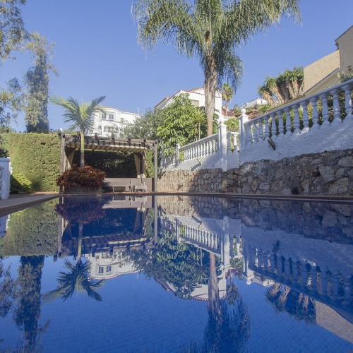 This spacious modern villa is located in a prime area of Benalmádena, near Xanit Hospital, and enjoys clear views toward a protected area where construction is not permitted, ensuring privacy and the tranquility of having hardly any nearby neighbors.
