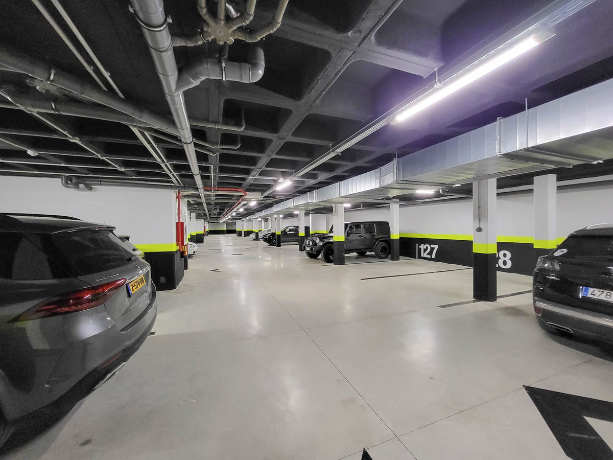 Två stora parkeringsplatser, varav den ena inkluderar en laddstation för el/hybridbil och en dedikerad förvaringsenhet.