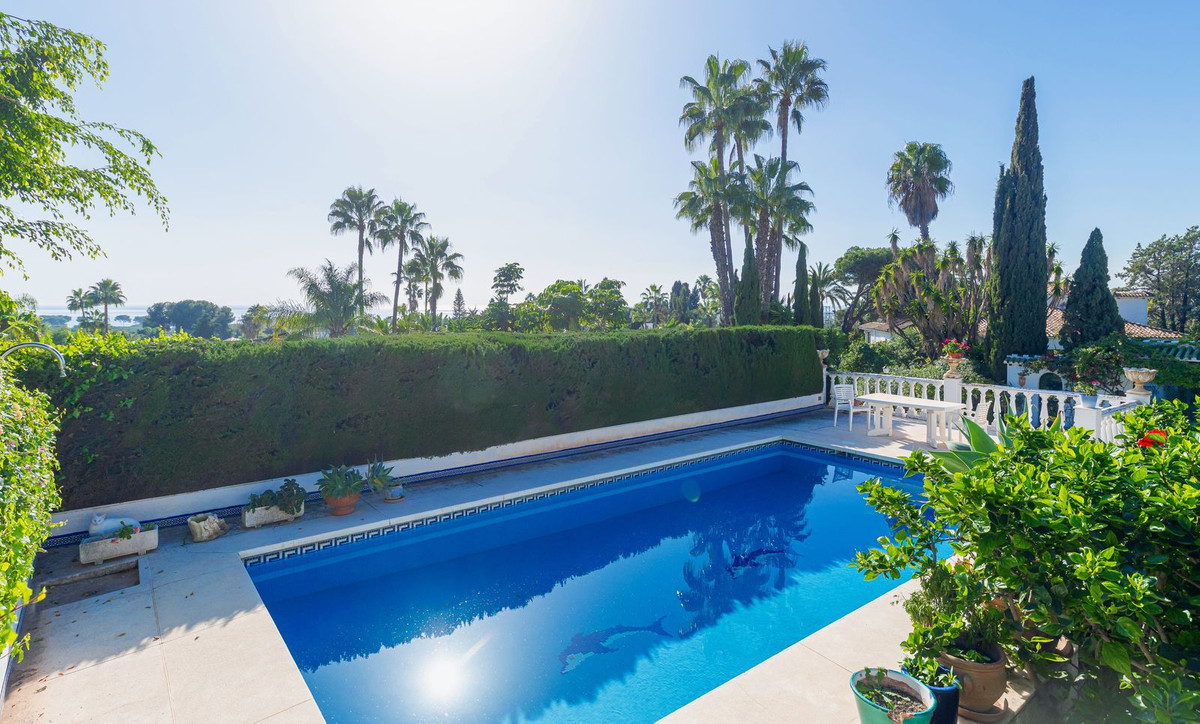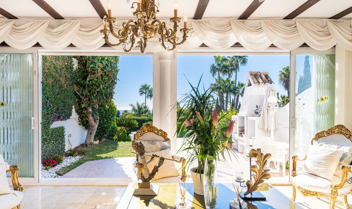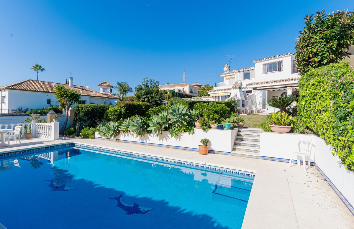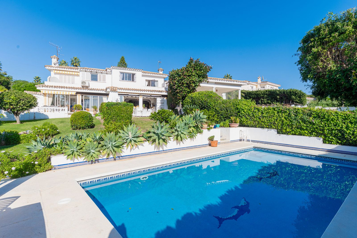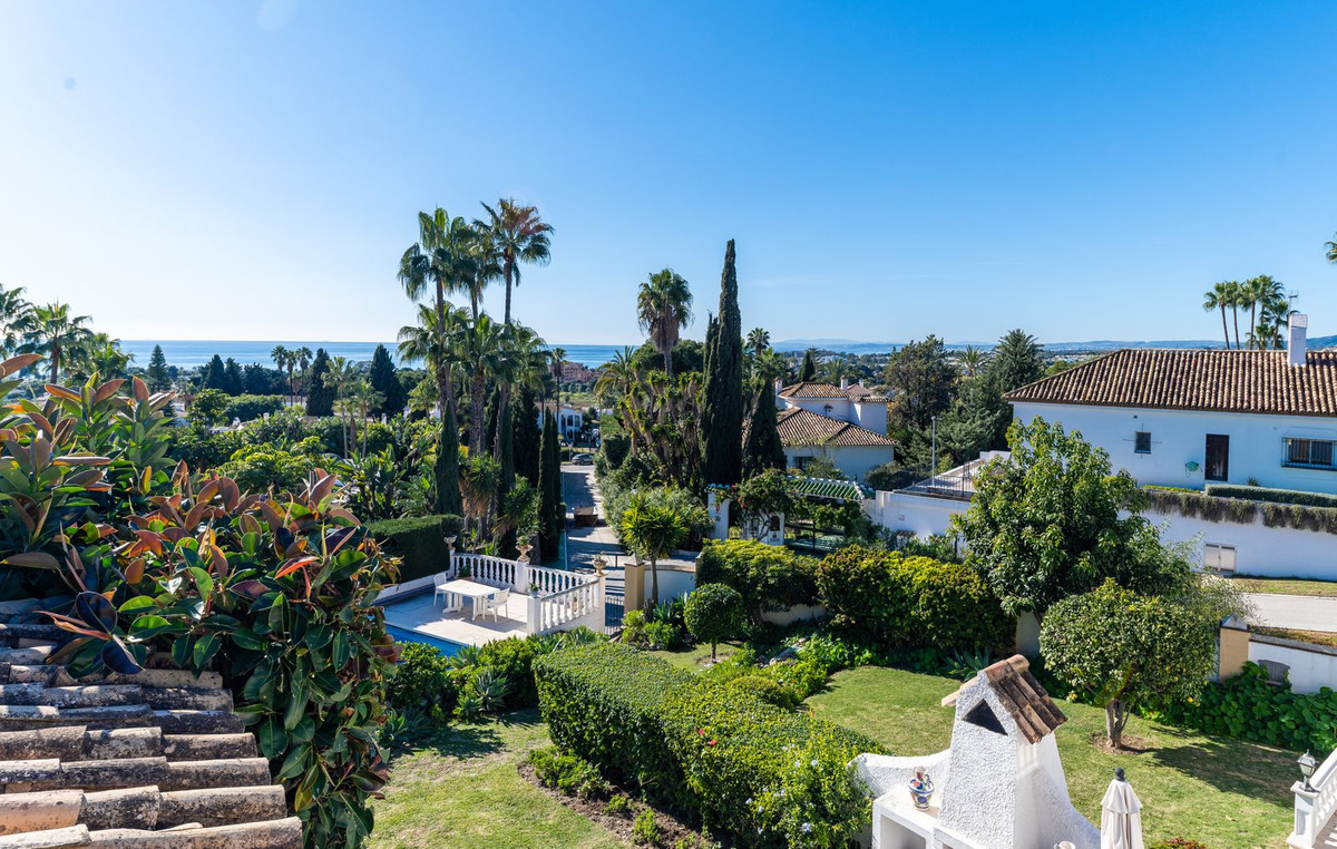 Utsökt havsutsikt semi-fristående villa fördelat på 2 rymliga nivåer med en vacker privat trädgård framför poolen omgiven av utsikt över flera höga tropiska palmer. Expertdesignad interiör och exteriör layout designad för att accentuera den avundsvärda andalusiska blommiga karaktären och atmosfären och atmosfären med panoramautsikt över havet. Önskvärt beläget inom en exceptionellt lugn tropisk palmkantad bostadsväg i El Paraiso, bredvid den berömda El Paraiso 18-håls golfbanan och mindre än 1 km från havet och de utsökta stränderna i Costalita.