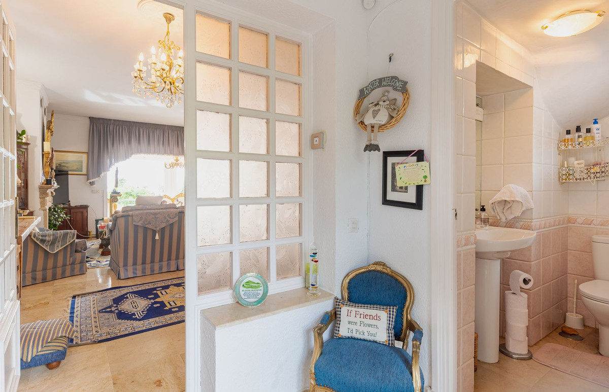Från ingångsporten en privat inhägnad trädgård kompletterar framsidan av fastigheten. Entréplanet på första våningen består av en hall som mynnar ut i en klassiskt inredd rymlig lounge designad för underhållning, middag och avkoppling, med en imponerande öppen spis i granit framför den stora soff- och TV-delen. Från loungen är en specialbyggd cocktaillounge designad med karakteristiska takbjälkar och har en integrerad drinkbar före middagen med höga pallar och en bänkskiva i baren med ytterligare avkoppling och avslappnande sittplatser på framsidan av den yttre terrassen och en utsökt trädgård som nås från vägg till vägg. skjutdörrar erbjuder absolut perfektion tropisk trädgård och utsikt över Medelhavet.