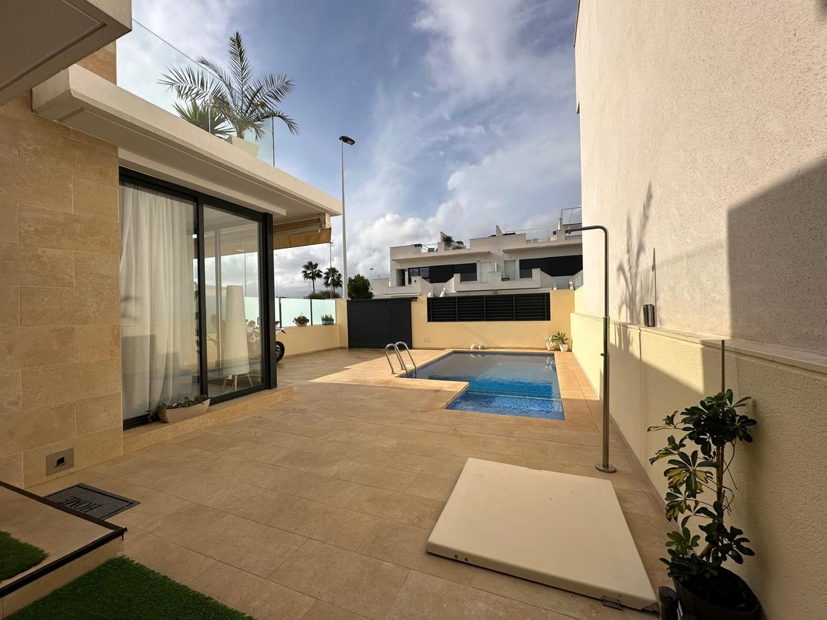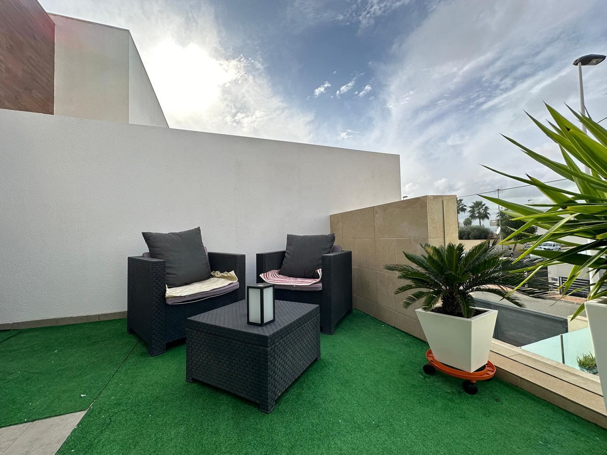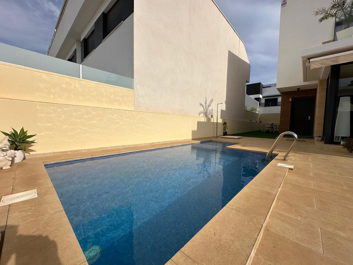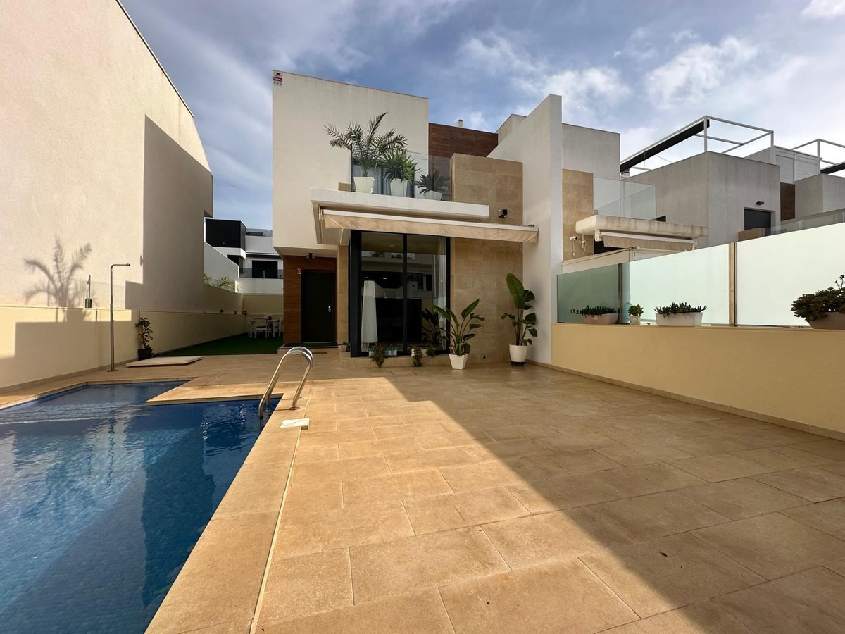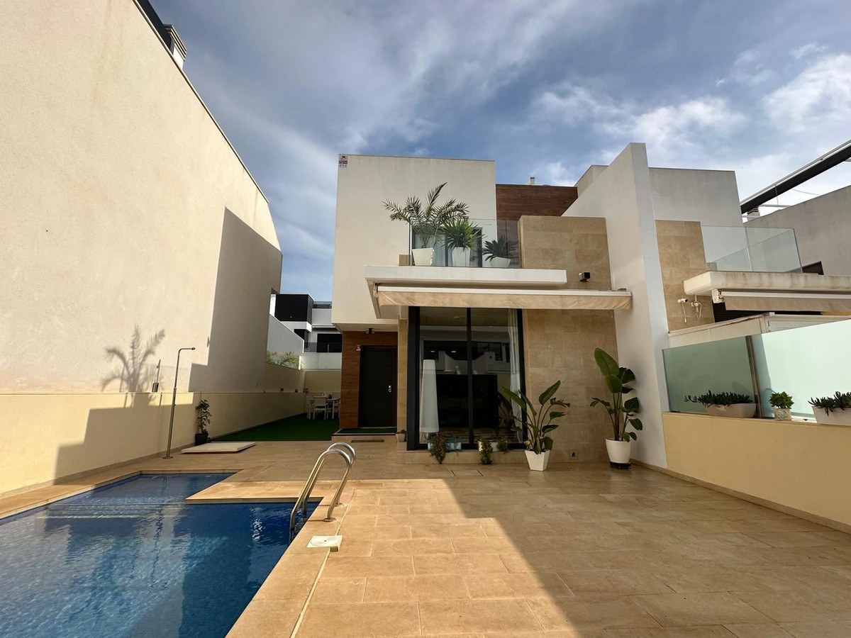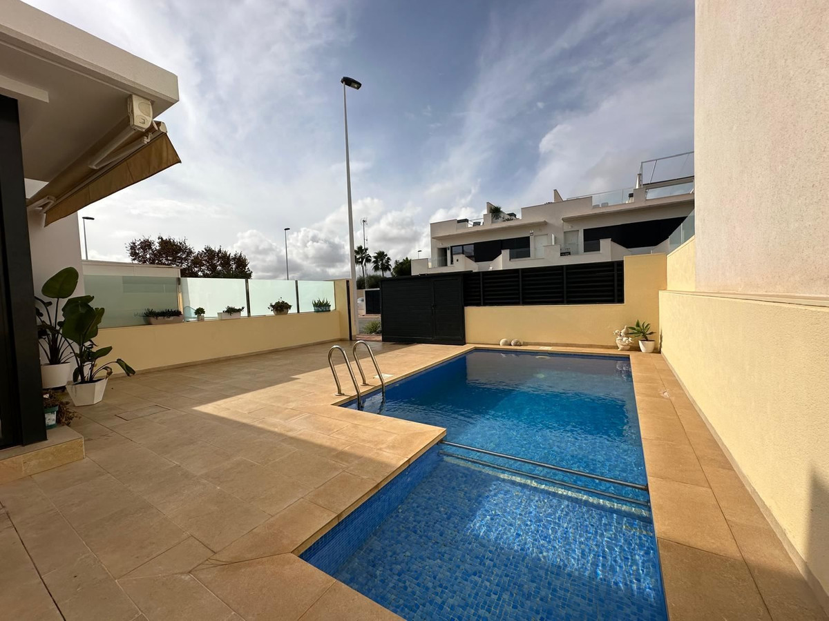 Välkommen till det populära området San Pedro del Pinatar och denna moderna och välplanerade villa med privat pool. Villan består av tre sovrum, tre badrum samt vardagsrum och kök i en öppen planlösning. Till detta kommer en rymlig terrass med plats för utemöbler och en solig takterrass.
