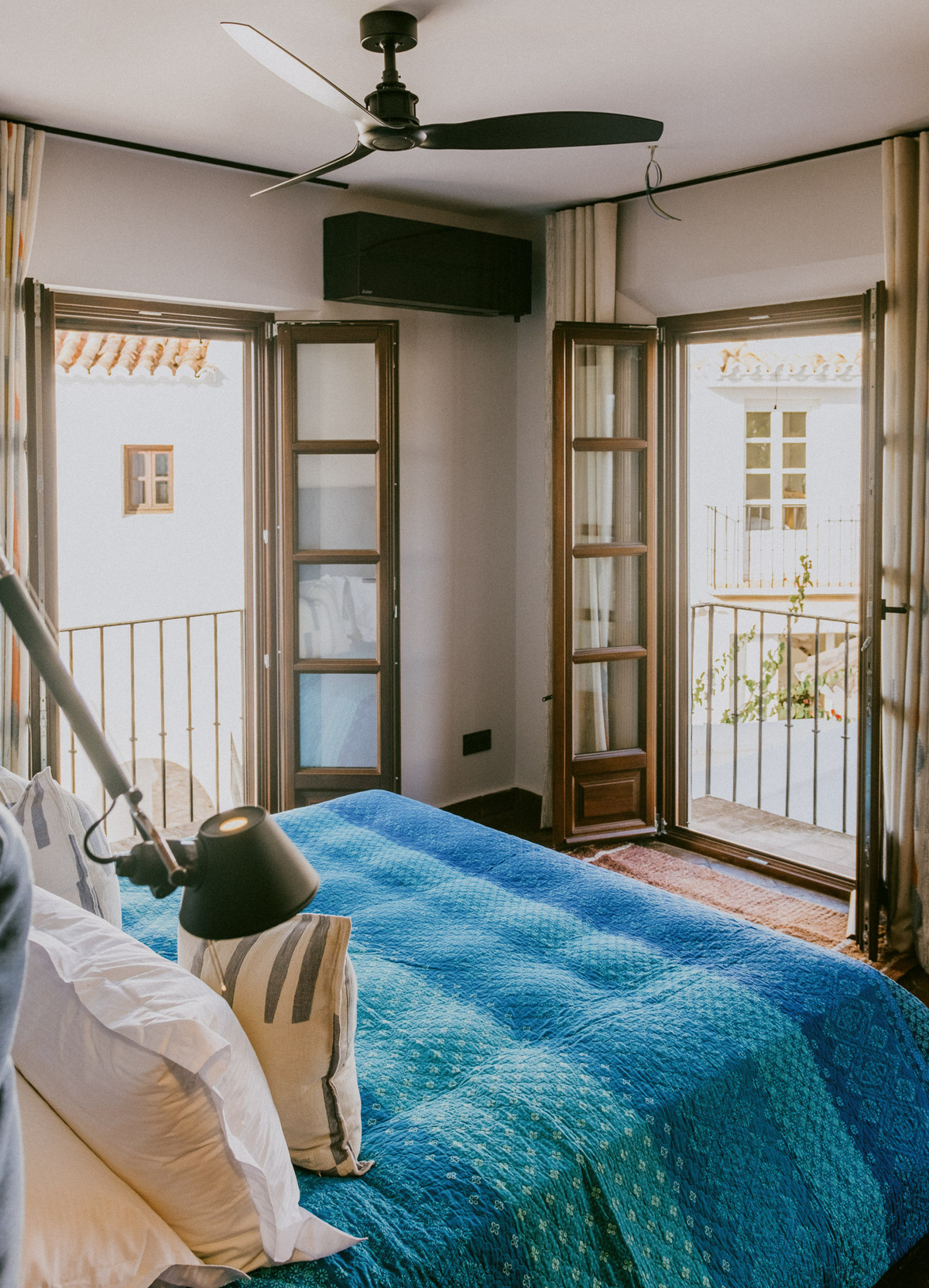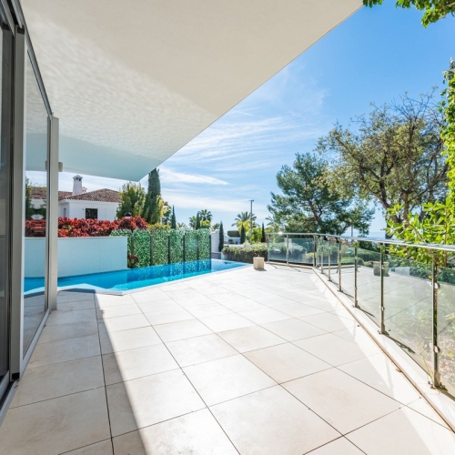 The open-plan living and dining area is bathed in natural light, providing a luxurious yet comfortable space with a real wood fireplace, perfect for relaxing or entertaining. Expansive glass doors lead to a private Andalusian-style patio, offering a serene retreat for outdoor relaxation.
