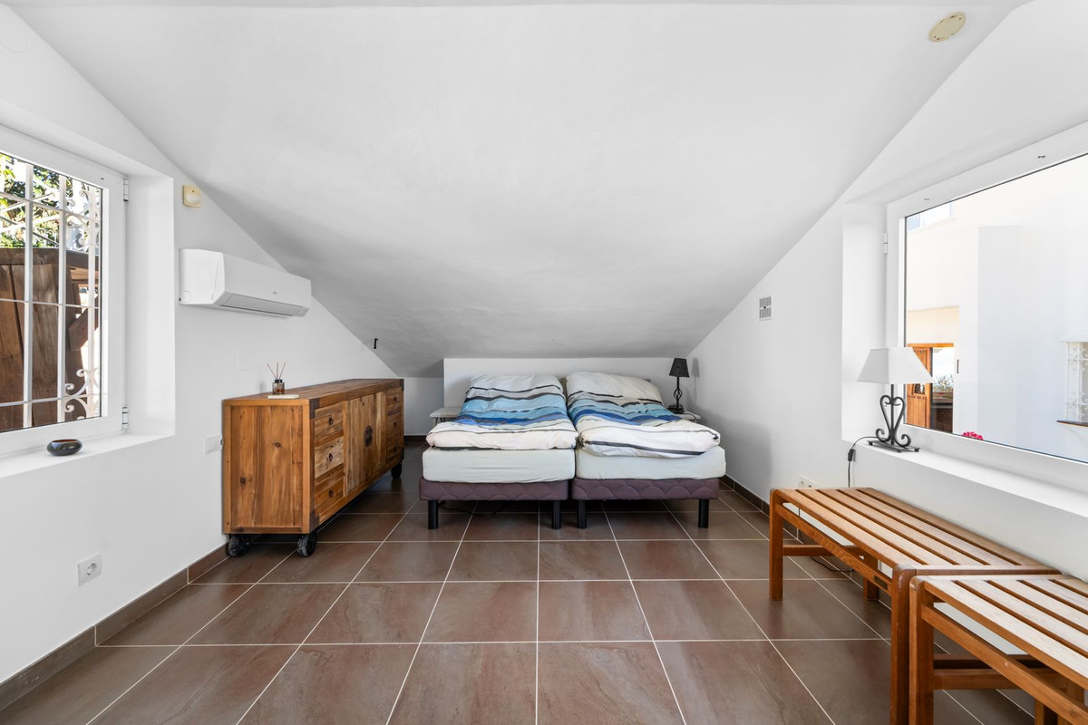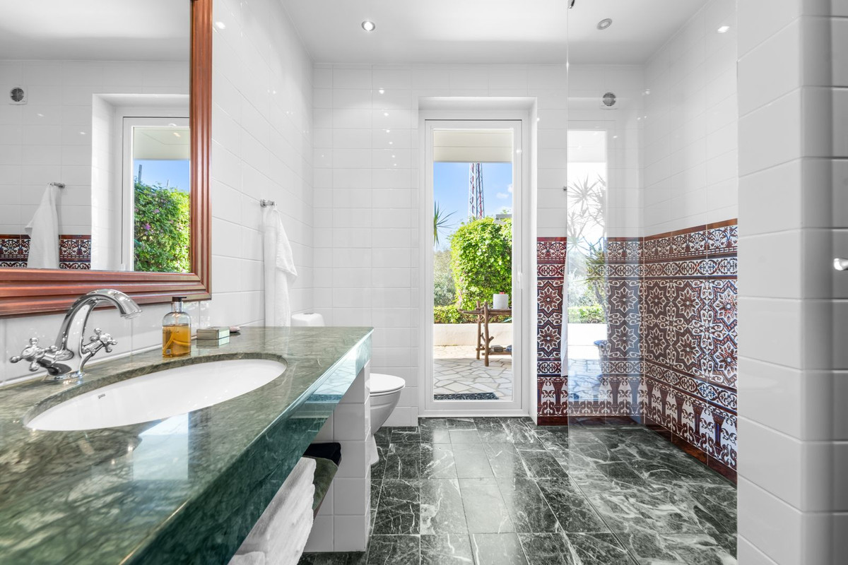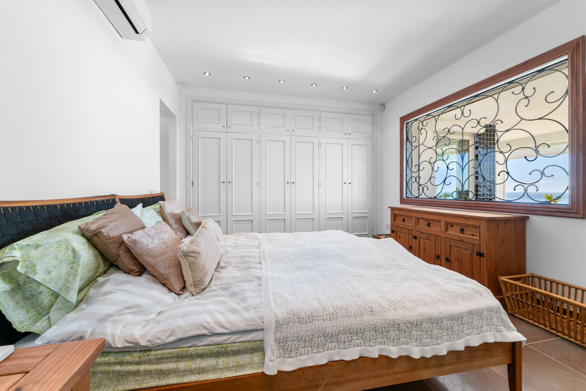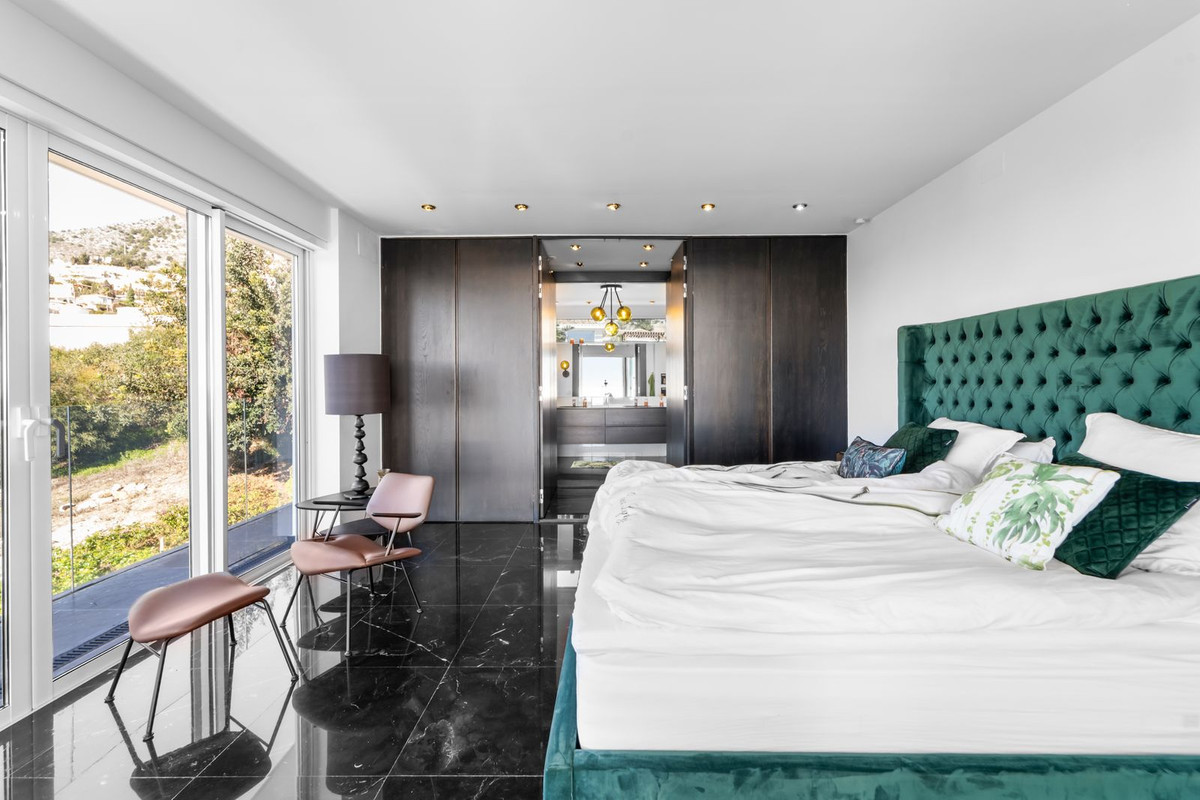 På övre våningen finns ytterligare ett sällskapsrum samt den exklusiva mastersviten. En elegant walk-in-closet fungerar som en dold passage till det privata badrummet. Härifrån nås också en täckt terrass med spektakulär havsutsikt.
