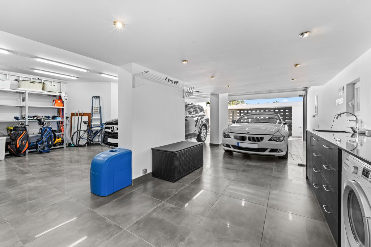 Det ljusa garaget rymmer upp till fyra bilar och fungerar även som tvättstuga. Det är byggt för att hålla sig helt torrt även vid kraftigt regn.