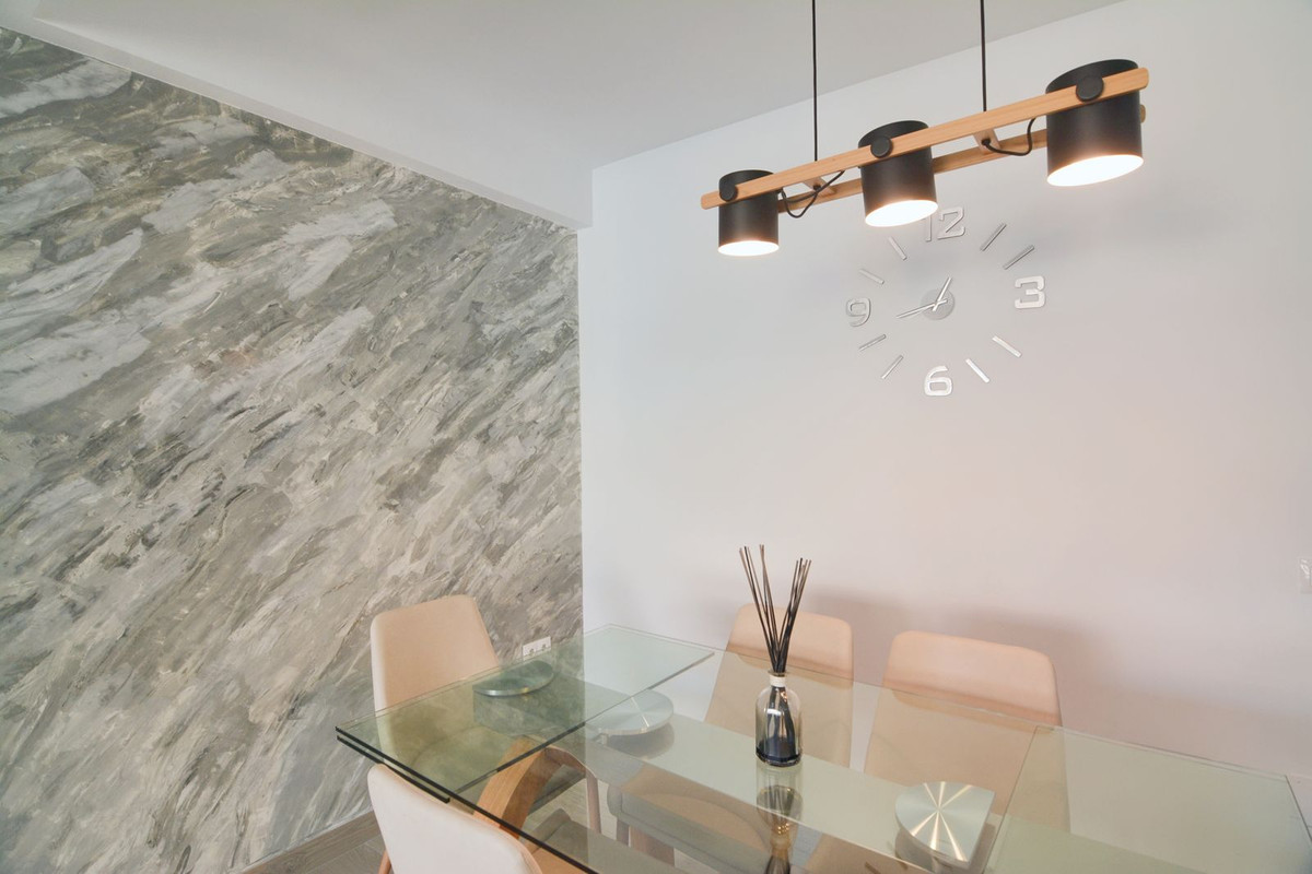Fastigheten har en rymlig entré med inbyggda garderober, ett ljust vardagsrum med direkt tillgång till en privat terrass som erbjuder fantastisk havsutsikt. Det separata köket är fullt utrustat och välventilerat.
