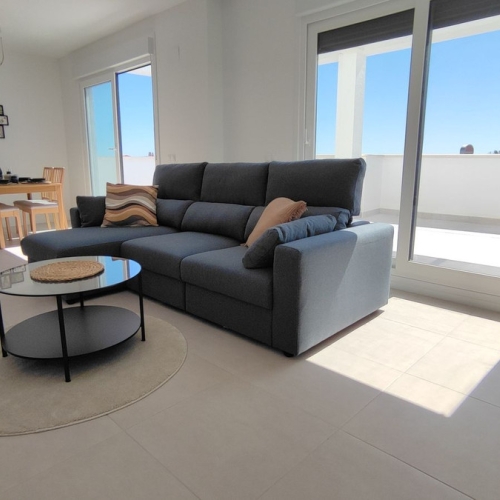 The property has three bedrooms, offering a comfortable and cozy space for the whole family. Two of the bedrooms have sea views, and the master bedroom includes an en-suite bathroom, providing privacy and comfort. The other two bedrooms share an additional bathroom, both equipped with quality finishes and porcelain floors. The third bedroom, however, is generously sized and includes a small additional storage room.