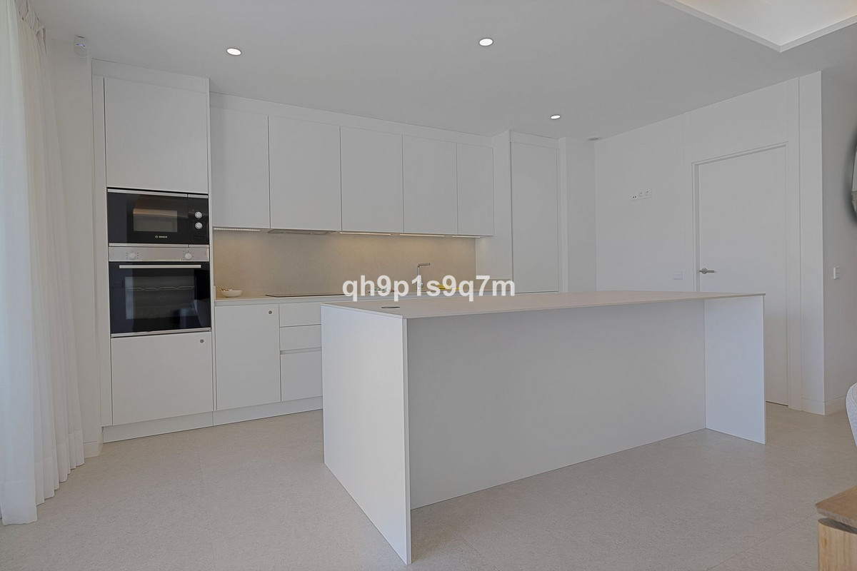 The apartment features three spacious bedrooms, including a master suite with an en suite bathroom and a walk-in wardrobe for added comfort and practicality. Two of the bedrooms open onto a private terrace, providing additional outdoor space to relax and enjoy the fresh sea air. The remaining bedroom is thoughtfully designed to accommodate guests or family members, with easy access to a second full bathroom and an additional guest toilet.