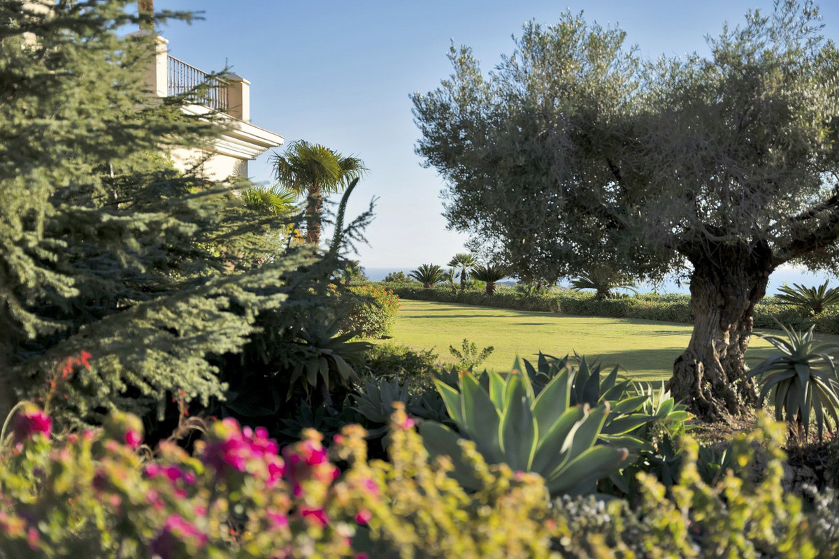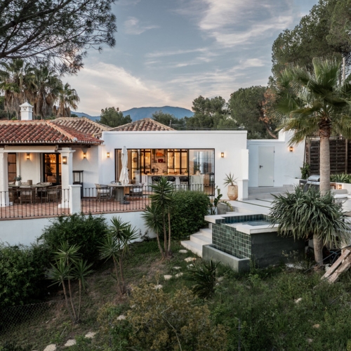 This exclusive property offers stunning views of the sea, the Spanish and African coasts and Gibraltar and is situated in a very private and protected location in the elegant and gated Marbella Club Golf Resort. Built with the highest quality; solid wooden floors, Travertino marble, custom made windows, excellent isolation, very modern domotic system, solar and heat pumps for hot water and heating, individually adjustable underfloor heating (solar energy) throughout the house, illuminated and heated swimming pool, poolside barbecue area, spa and gym area, wine cellar, elegant eat-in kitchen, spacious ensuite bedrooms with adjoining bathrooms, are just some of the many outstanding amenities of this beautiful home. The garden is a dream, it has been lovingly landscaped and planned by its owners and has a fully automatic irrigation system. The flat plateau plot has been secured on all sides and is well fenced. Marbella Club Golf Resort with its 18-hole golf course is very privileged and private, yet only 20 minutes away from Marbella, located in the middle of the beautiful Benahavis mountains. This residential area has a gated entrance and 24-hour security. Marbella Club Golf Resort has a wonderful restaurant just 10min walk from the villa where You can enjoy a wonderful meal and a glass of wine.