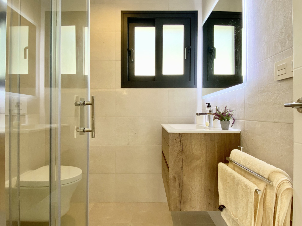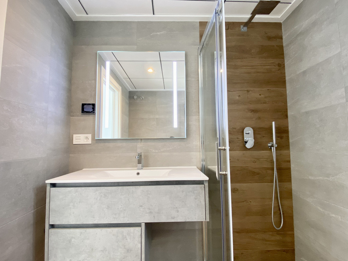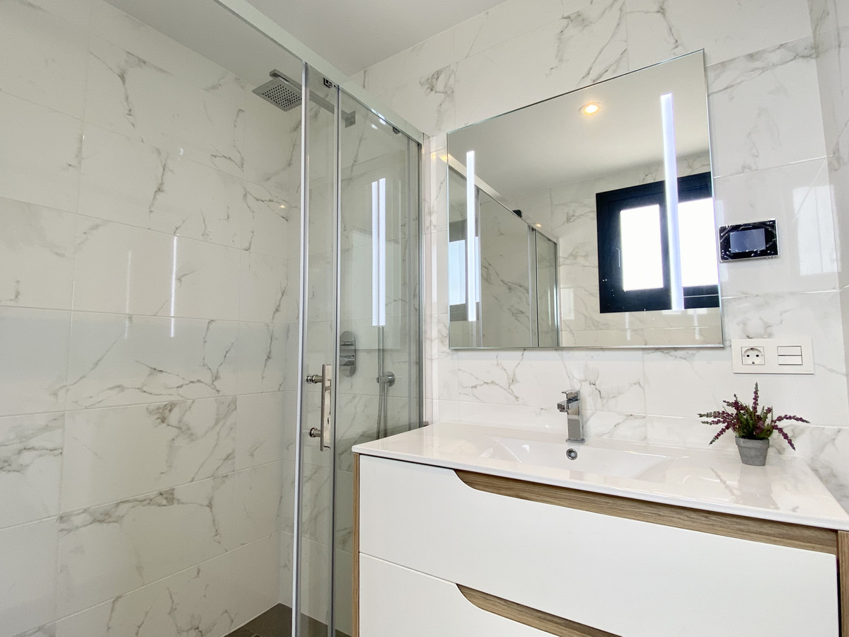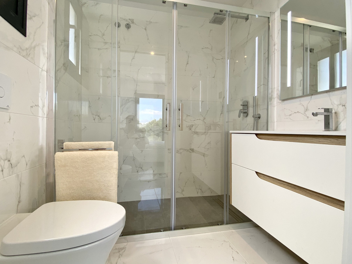 På första våningen finns två en-suite sovrum med respektive terrasser. Hallen ger tillgång till solariumet, som fungerar som husets platta tak.