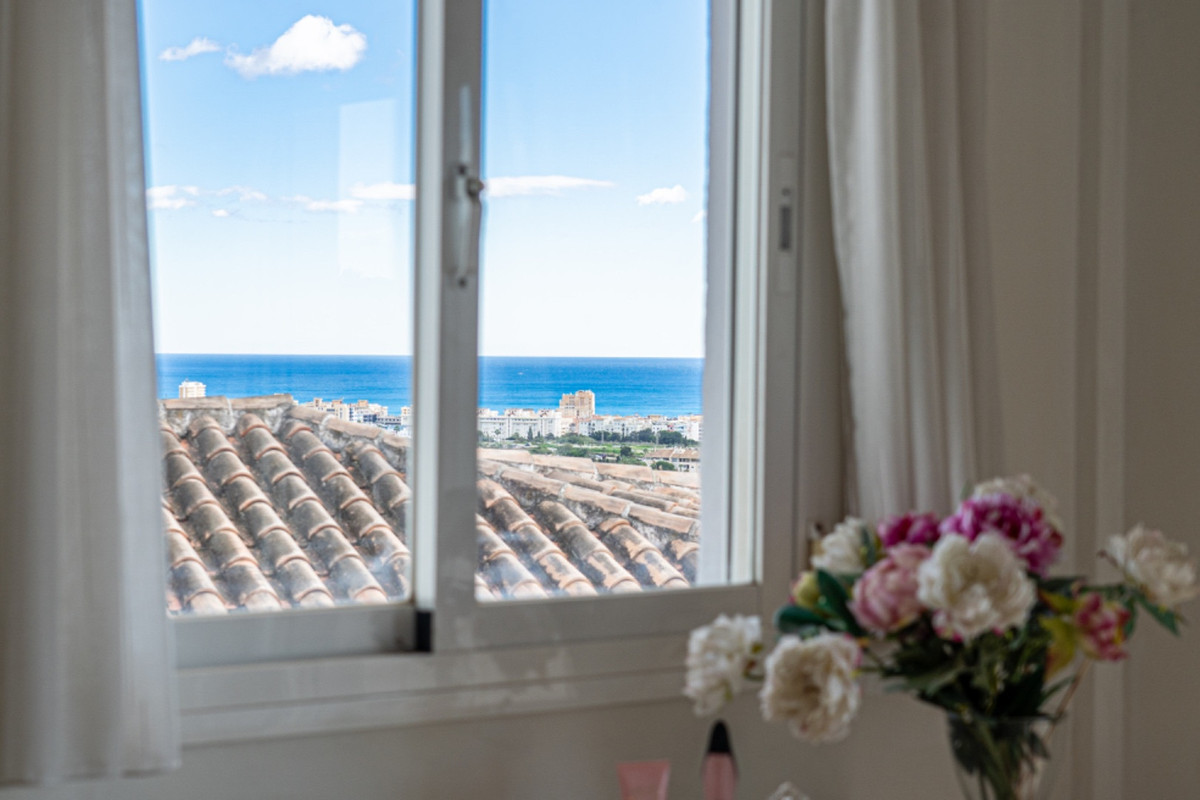 The bright living and dining areas flow seamlessly together, creating a relaxed atmosphere with large windows that fill the space with natural light. The living room includes an open fireplace and marble floors, offering comfort and style in equal measure. Upstairs are three double bedrooms, including a serene main suite with private terrace and sea views. Each room is thoughtfully designed with calming tones and quality finishes.