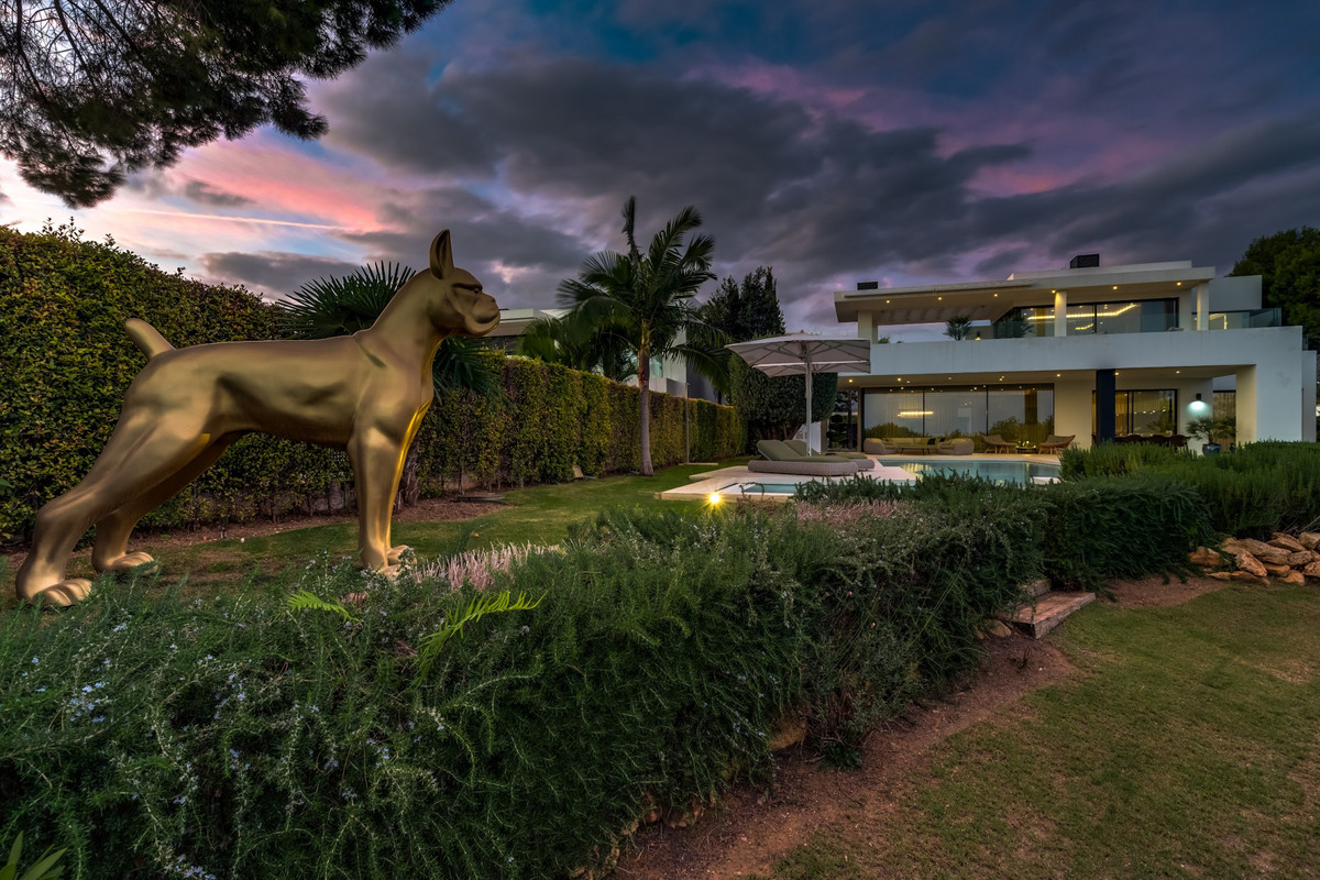Denna exceptionella villa är inbäddad i en exklusiv gated community på Marbellas prestigefyllda Golden Mile. Belägen på en generös sydvänd tomt, badar fastigheten i naturligt ljus och erbjuder hisnande panoramautsikt över havet från båda våningarna.