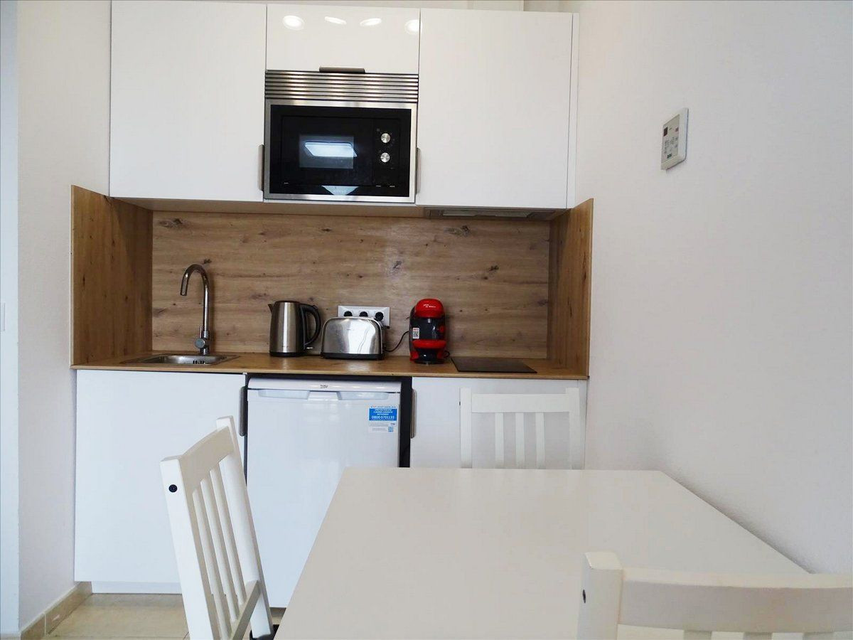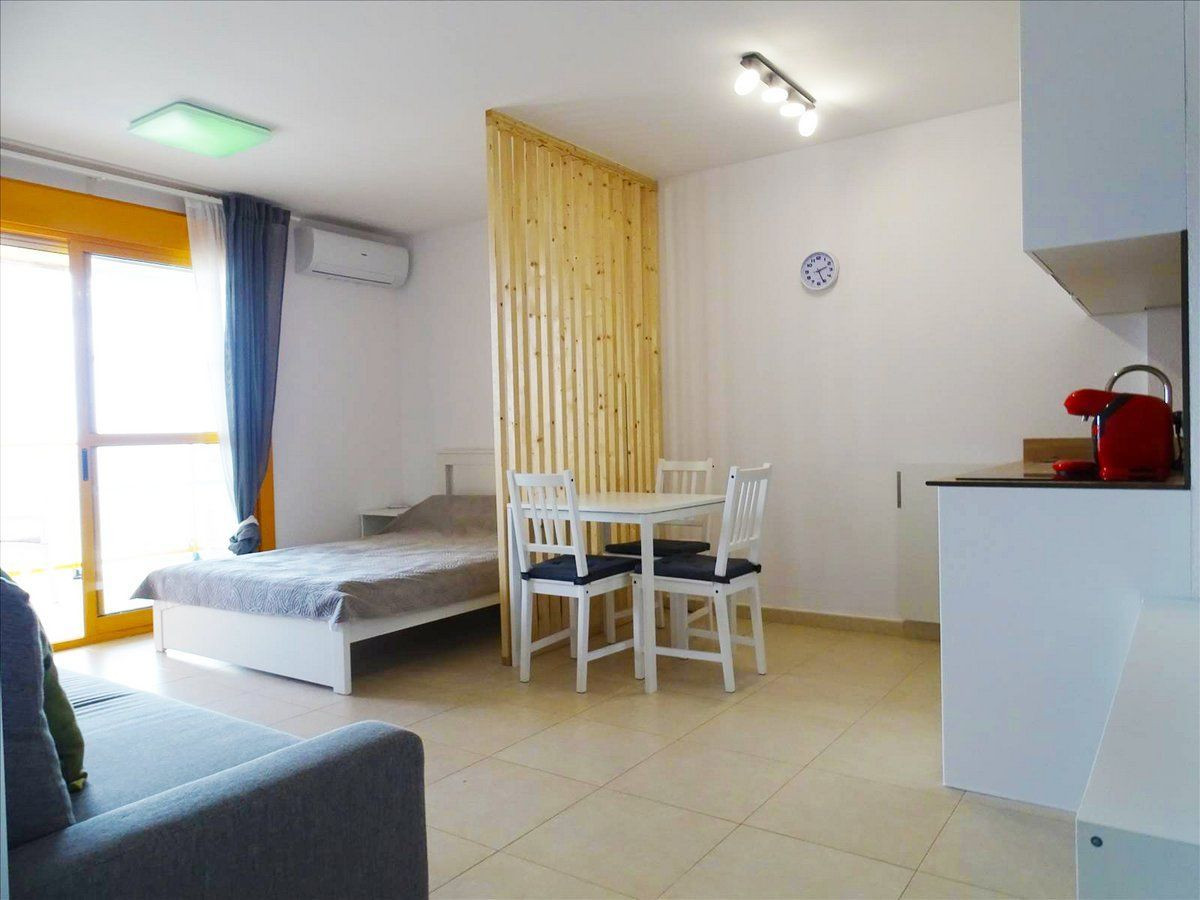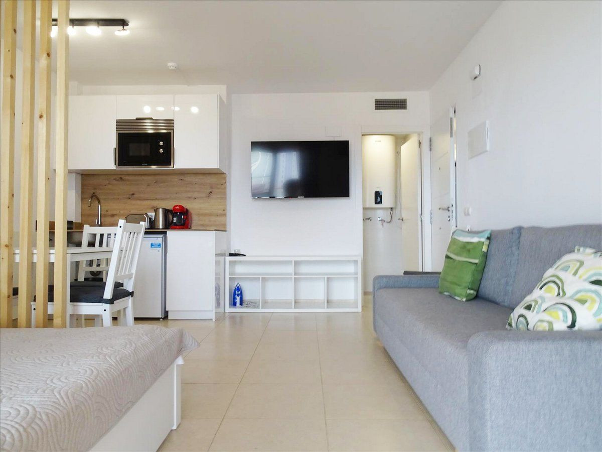 - Layout: This cozy one-bedroom apartment features a bright living room connected to a fully equipped open kitchen, creating a fluid and functional space. It also includes a bathroom, and the private terrace offers sea views, ideal for relaxing or enjoying sunsets.